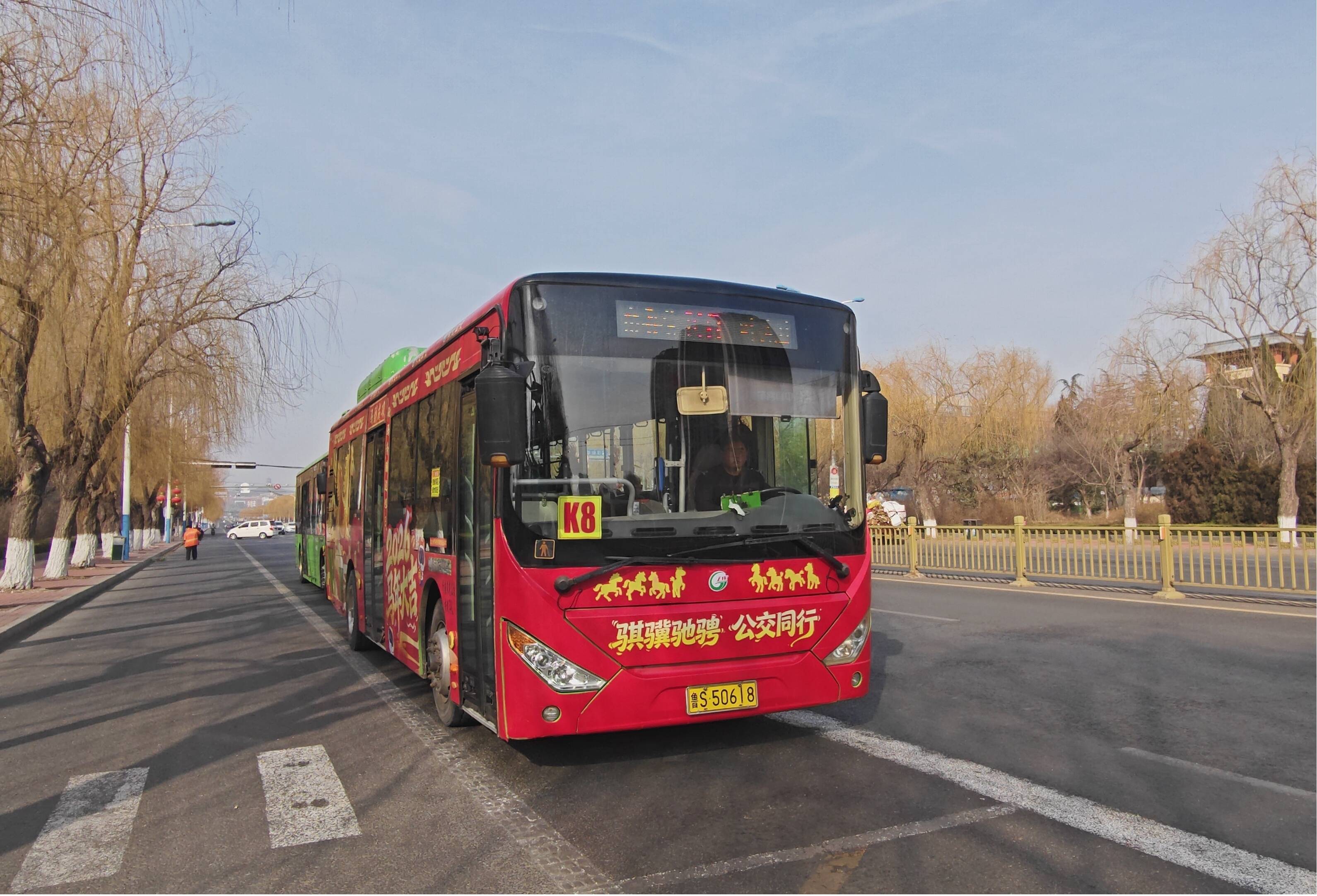 如果说贺岁候车亭是静候您的风景,那么在城区穿行的K8路“马年贺岁主题车”,就是驶向您的一路欢歌。身披锦绣“新装”的公交车,以昂扬奔腾的骏马形象为核心,配以“马年大吉、马到成功”祝福语,寓意新年一马当先、前程似锦,成为了城区最引人注目的“移动祥瑞”。