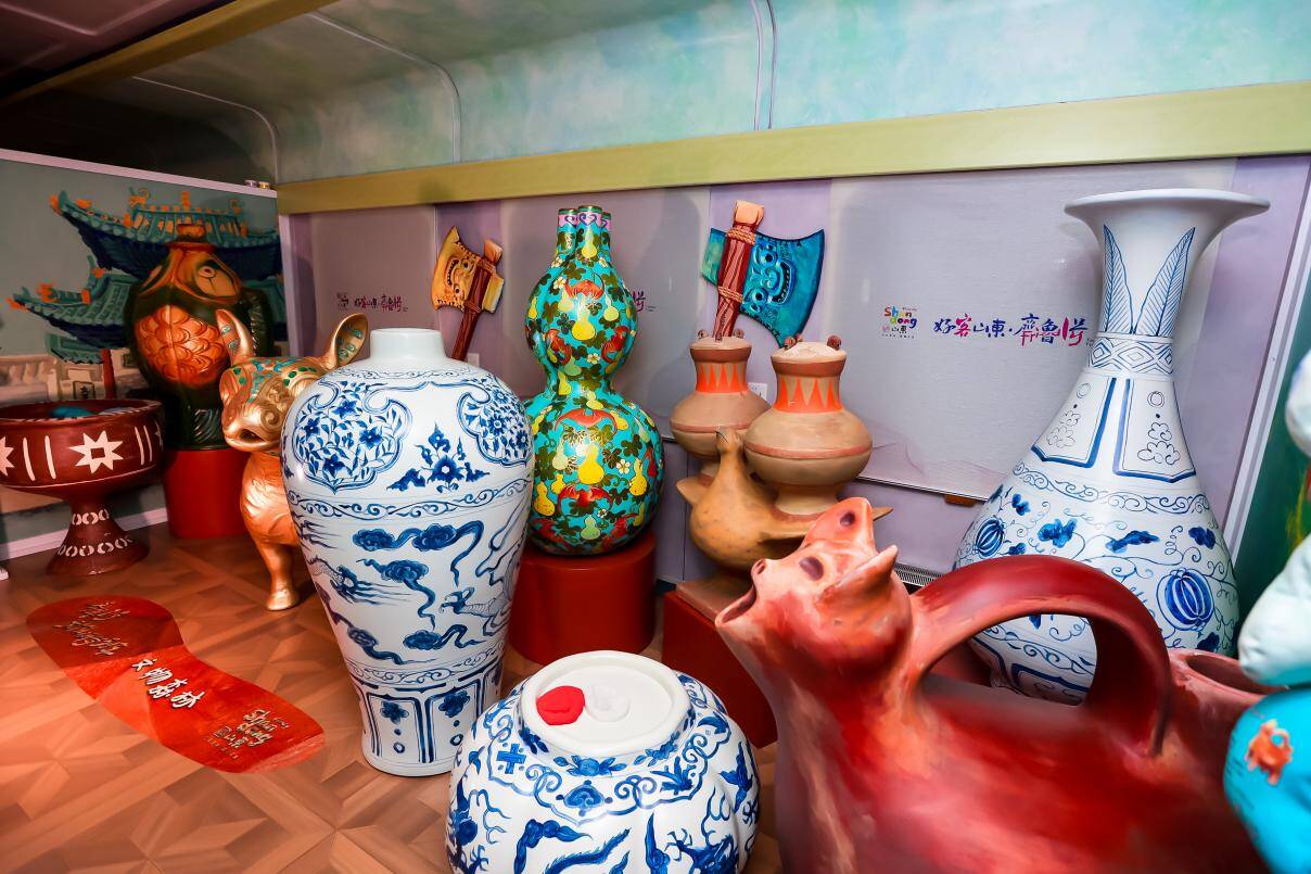 列车以“移动的博物馆,流动的课堂”为核心设计理念,突破传统博物馆的静态与地域限制,通过独特的视觉绘画与互动体验设计,将每节车厢转化为生动的文化展厅。列车设置青铜、玉、瓷、陶、画像石、建筑、服饰七大主题车厢,兼顾馆藏文物与地面文物元素,均衡融入山东、河北两省重点文物资源,让乘客在旅途中沉浸式感受历史文化魅力。