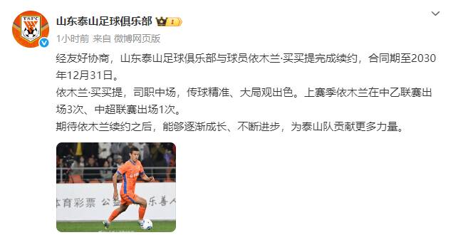 闪电体育2月16日讯 今天,山东泰山宣布,与20岁中场依木兰完成续约,合同期至2030年12月31日。