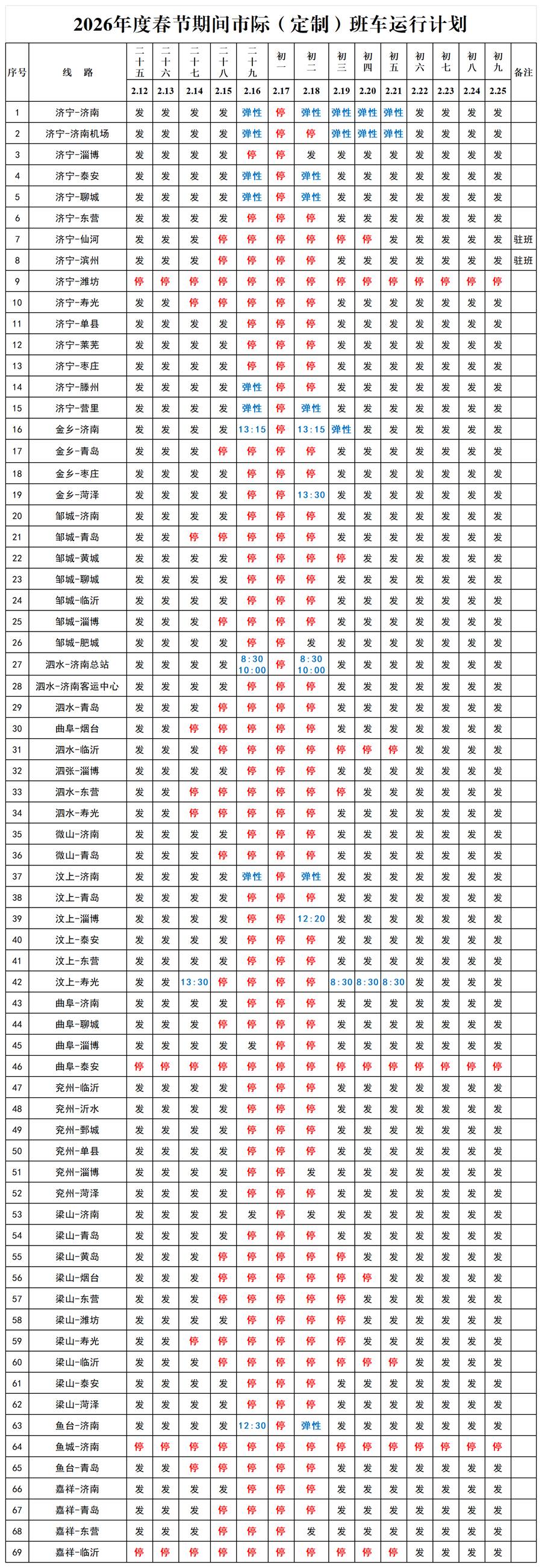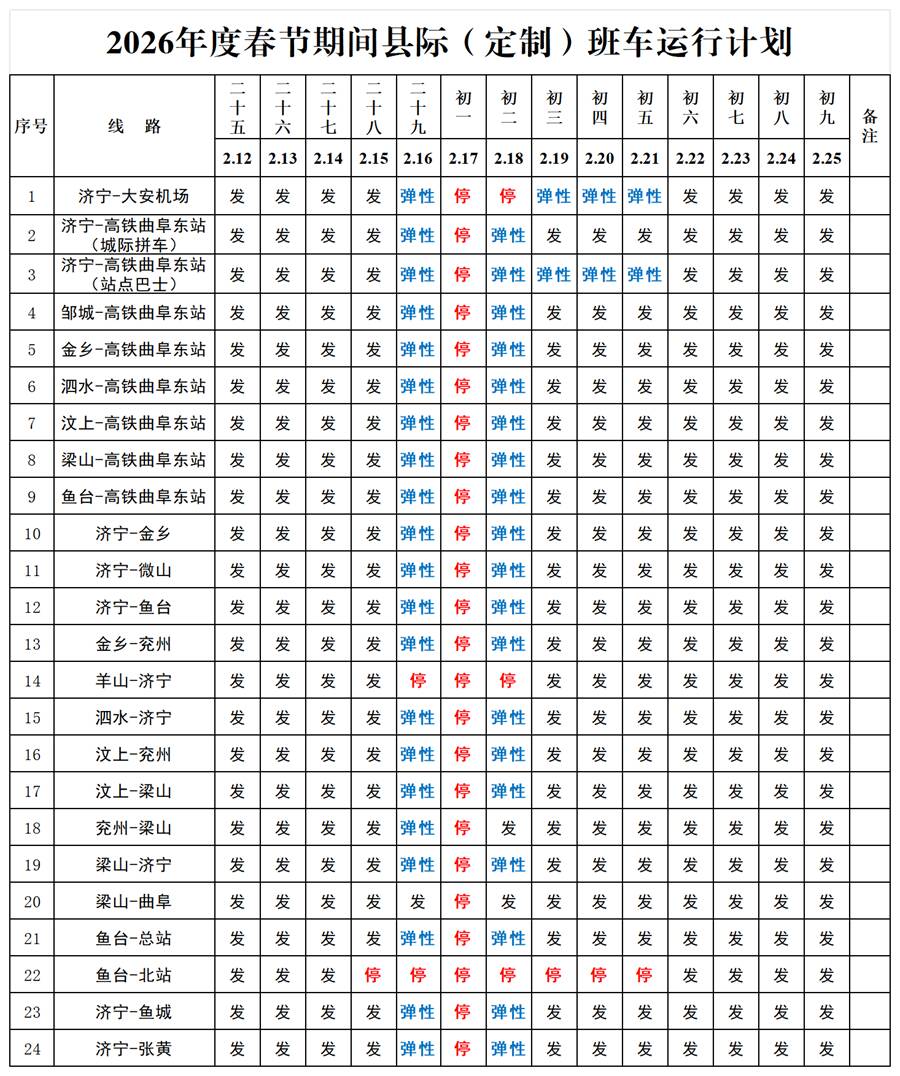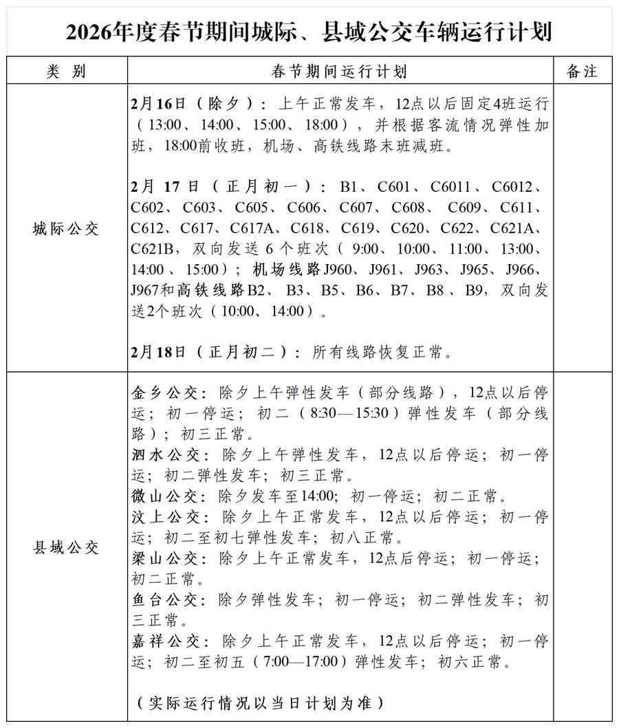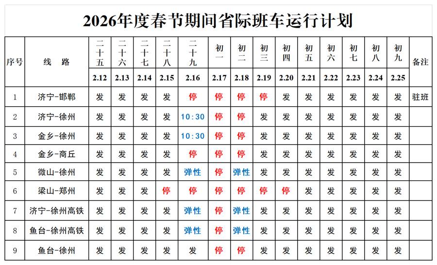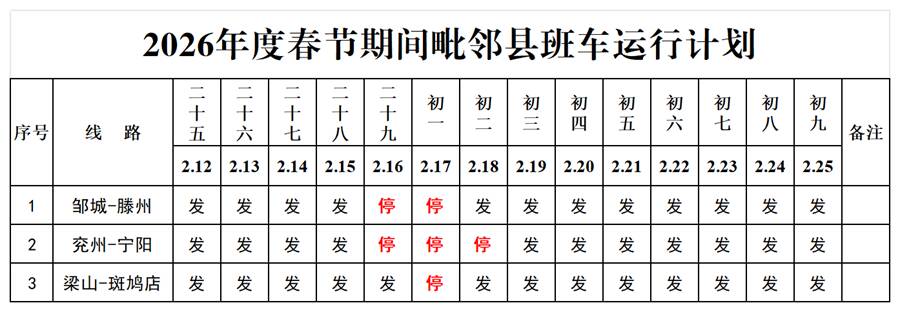 齐鲁网·闪电新闻2月16日讯 为了方便广大旅客春节期间的出行,济宁交运集团日前将济宁各汽车站春节期间客车运行计划予以公示,请各位旅客提前做好出行规划,避免延误行程。实际运行情况以当日计划为准。