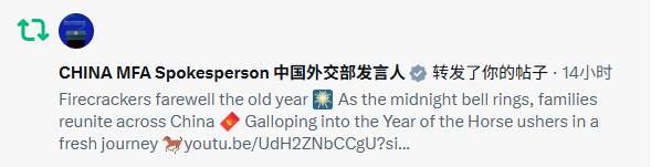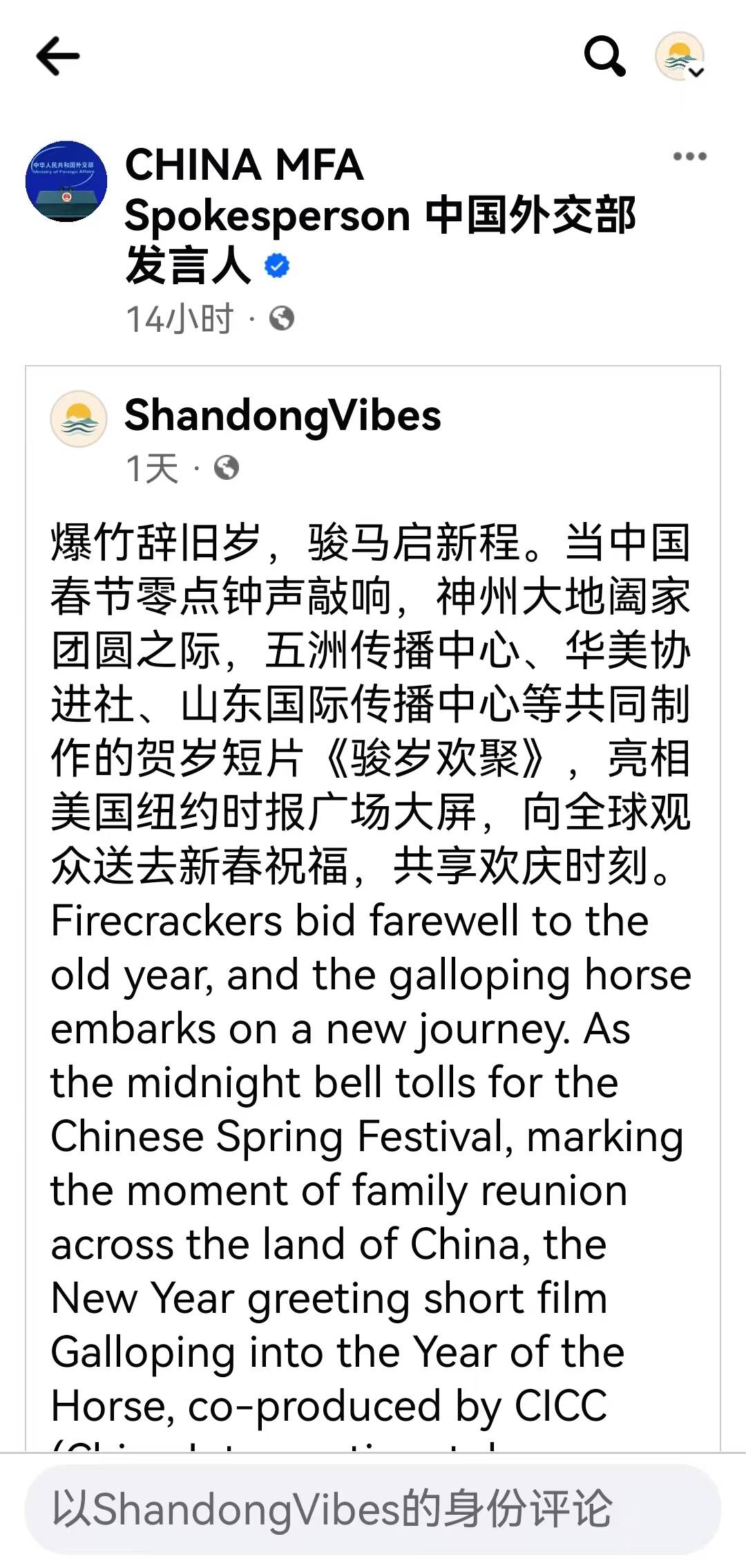 齐鲁网·闪电新闻2月19日讯 2月16日,由五洲传播中心、华美协进社、山东国际传播中心等共同制作的贺岁短片《骏岁欢聚》登陆美国纽约时报(NYT)广场大屏幕,向全球传递中国的新春祝福。短片中,2026山东春晚精彩瞬间亮相,成为展示中国春节文化的重要元素。相关内容被中国外交部发言人FACEBOOK、X官方账号转发。