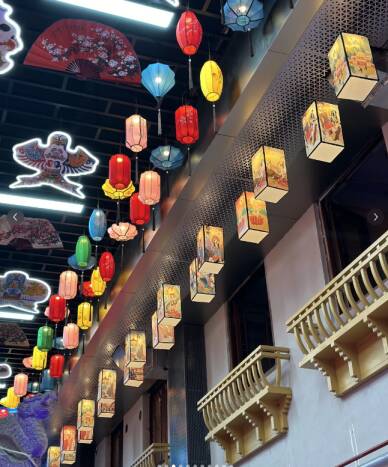 重装升级后的老潍县美食街,保留传统潍县建筑风格,融入风筝、年画、剪纸、灯笼等潍坊特色国潮元素,搭配33米长3D裸眼大屏与光影装饰,新春期间张灯结彩,年味浓郁;同时设置现场手工艺制作区,让聚会之余可体验潍县文化,丰富欢聚体验。