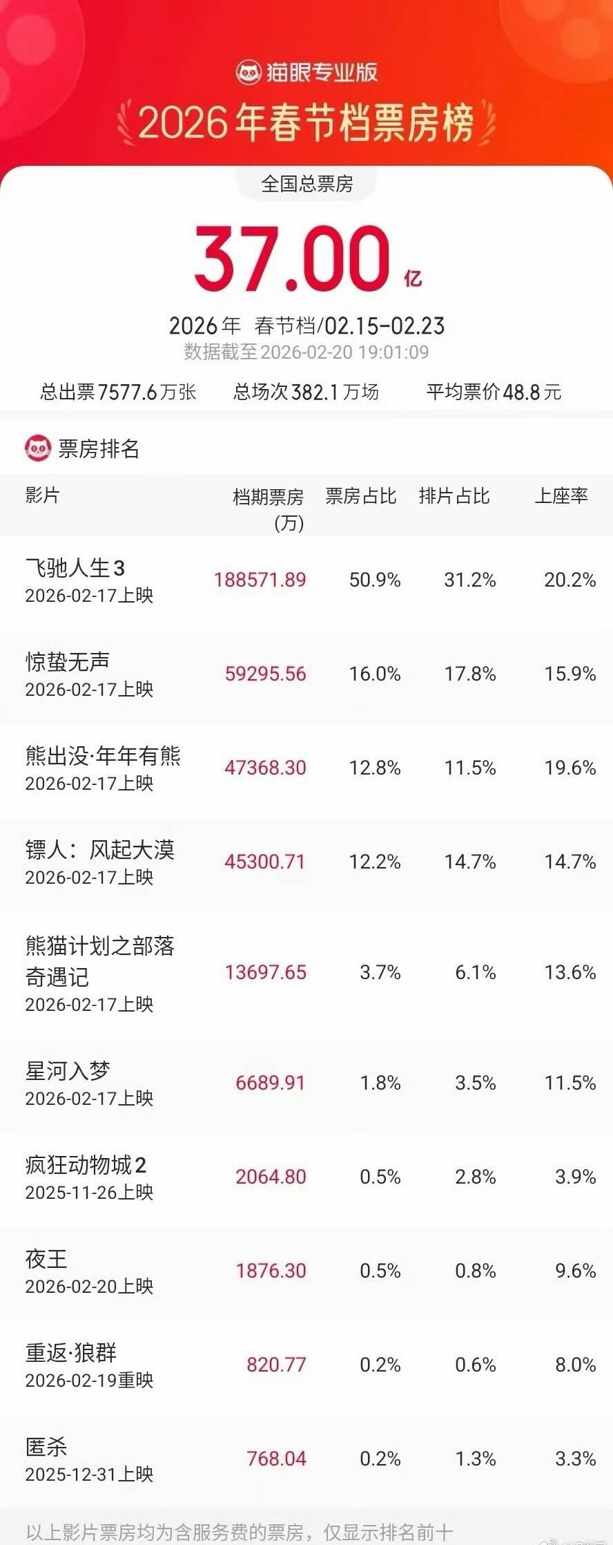 据猫眼专业版,截至2月20日19时01分,2026春节档(2月15日-2月23日)档期总票房(含预售)突破37亿元,《飞驰人生3》《惊蛰无声》《熊出没.年年有熊》分列前三位。在长达9天的春节假期里,中国电影市场用一份亮眼的成绩单,奏响了新春经济的“开场曲”。
