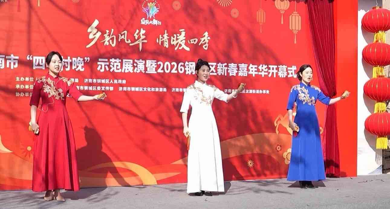 位于济南市钢城区颜庄街道的澜头村,以古宅、老街、非遗等特色资源为载体,打造新春沉浸式游览场景。青砖黛瓦间,文艺演出与古村风貌深度融合,游客在游览中感受传统年俗的独特魅力。春节假日期间,景区每天定时推出精彩演出:节奏明快的快板点燃现场热情,一柔一刚的歌曲传递节日温情,活力四射的舞蹈燃爆全场,精彩绝伦的变脸技艺更是赢得观众阵阵喝彩,掌声与欢笑声回荡在古村上空。