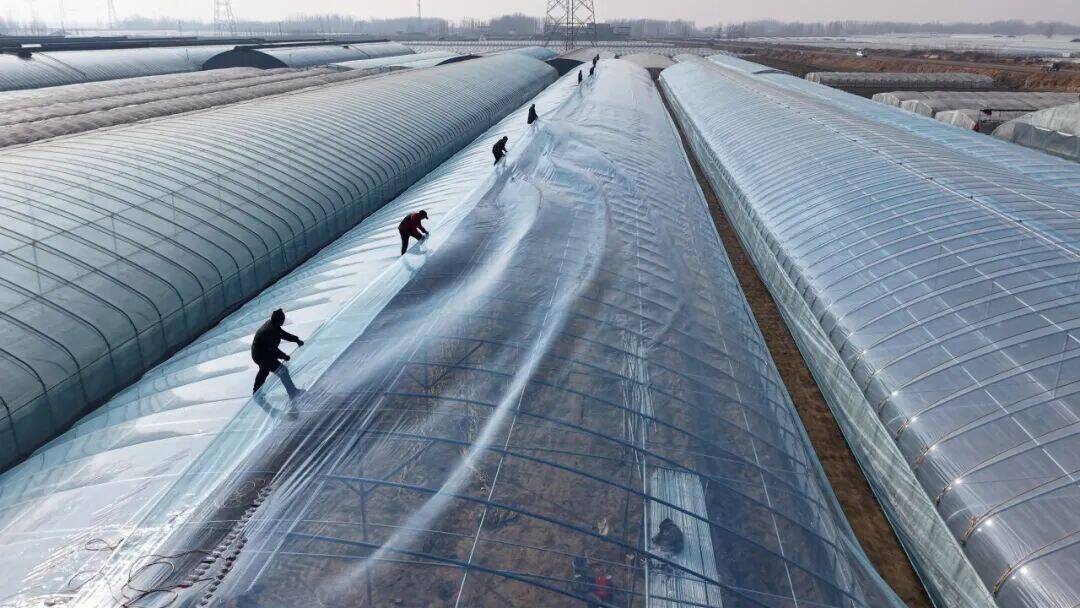 在董杜庄镇前花庄村大棚改造基地,工人们忙碌的身影穿梭其间,欢声笑语此起彼伏,一派热火朝天的建设场景,成为新春时节基层大干实干的生动写照。六座高标准钢结构大棚拔地而起,工人们正加紧覆膜作业,冲刺建设收尾,只为让大棚尽快投入种植,抢抓春季种植黄金期,为全年西瓜丰产丰收筑牢基础。
