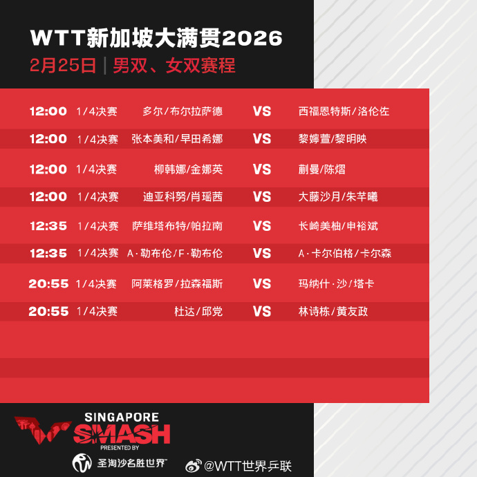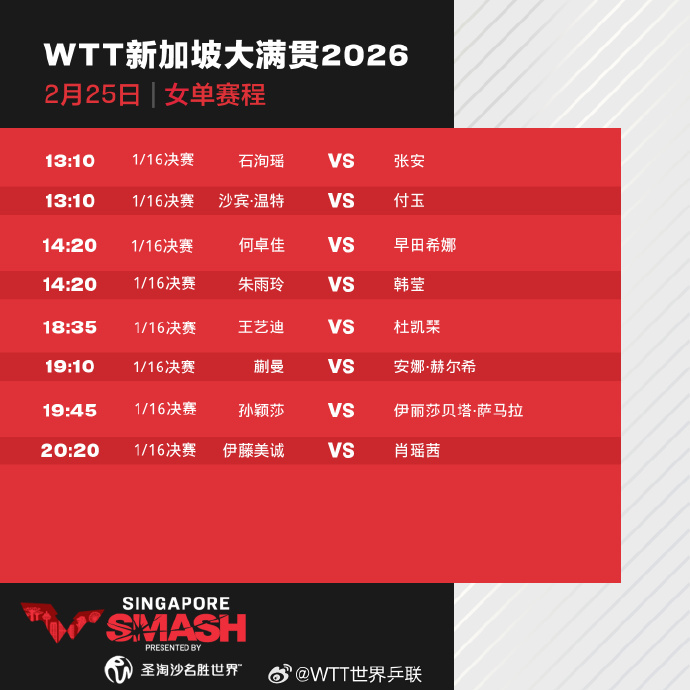 25日,2026年WTT新加坡大满贯进入正赛第四天,孙颖莎、蒯曼、向鹏、陈垣宇等出场。具体赛程如下: