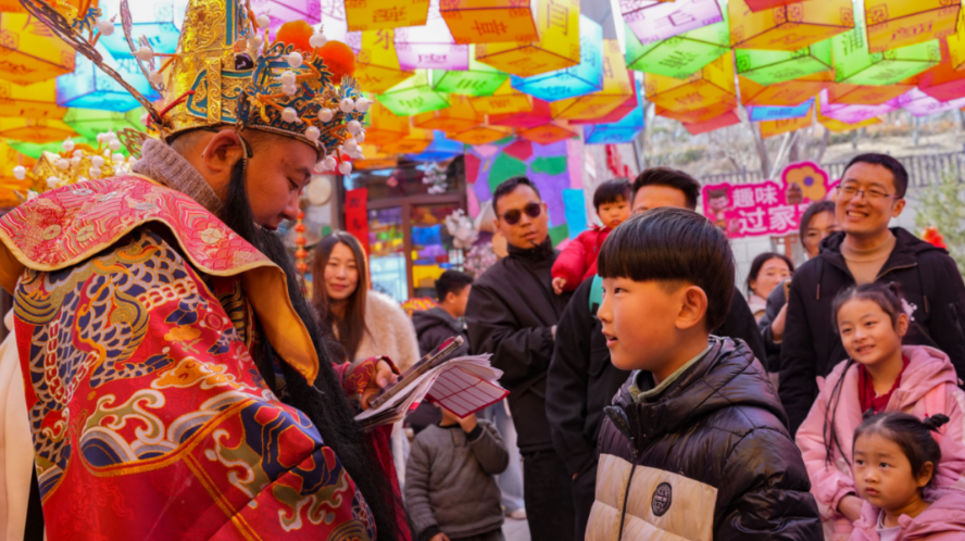 记者从泰山石敢当景区了解到,2026年春节假期期间,景区客流量较2025年同期大幅增长40%,创下了累计接待游客超6万人次的成绩,全网曝光量突破3000万+,游客好评率达95.1%。2月13日至2月23日,景区各类演艺活动轮番上演,累计演出1140场,真正实现“十米一戏,步步惊喜”。百名NPC组成的奇幻互动阵容全程在岗,累计发放银票6万张,财神送福、不倒翁互动等环节人气爆棚,成为游客必体验的新春项目。《绸吊表演》凌空飞舞、场场爆满,趣味《科学秀》引得孩子们欢呼不断,川剧变脸绝活更是让游客近距离感受传统艺术魅力。