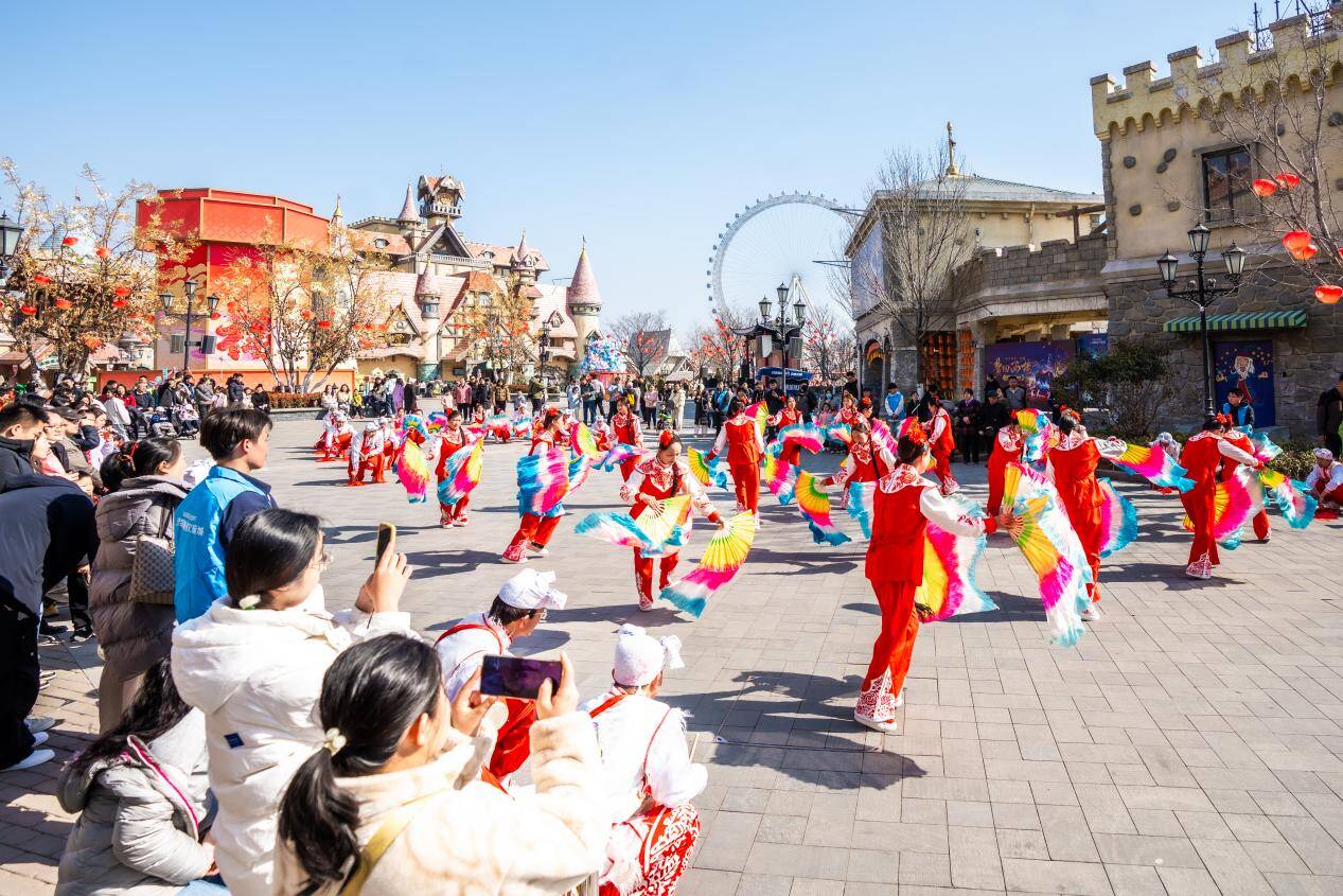 春节期间,乐园演出场次密集,内容丰富多彩。园区每日安排各类演出50余场次,累计演出总场次突破350场。从核心演艺《梦回西楼》《西游大联欢》到非遗传承项目《陕北秧歌》《京剧战鼓》《潮汕英歌舞》,从白天的巡游互动到夜间的“蹦仙迪”潮流派对,全天候、多时段的演艺安排满足了不同年龄段游客的观赏需求。