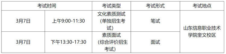 (1)单独招生:由“文化素质+专业技能”的考试组成,总分为430分,专业技能测试成绩230分,文化素质考试成绩200分。文化素质测试:由我校统一组织,由语文、数学、英语三科组成(语文80分,数学70分,英语50分)。专业技能测试:由山东省教育招生考试院统一组织考试,考试时间、地点请关注山东省教育招生考试院官方网站。