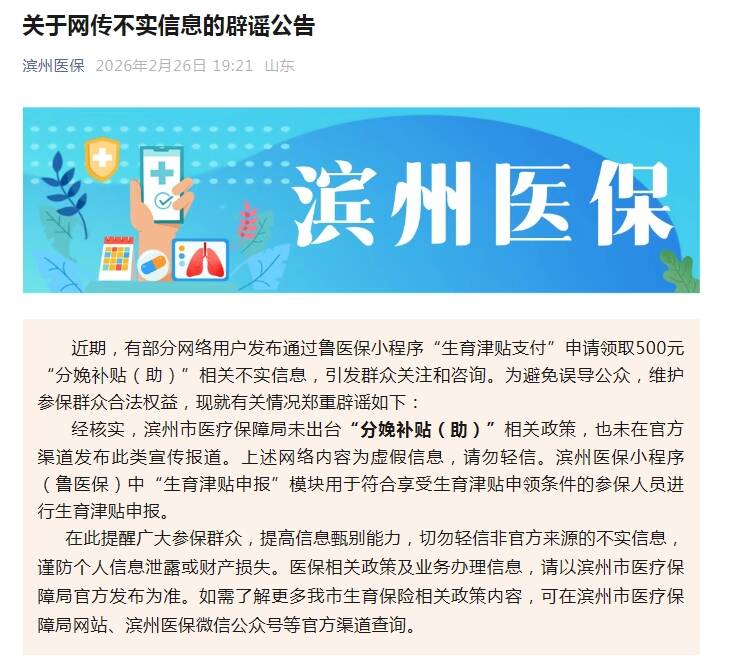 齐鲁网·闪电新闻2月27日讯 2月26日,滨州市医疗保障局发布关于网传不实信息的辟谣公告。近期,有部分网络用户发布通过鲁医保小程序“生育津贴支付”申请领取500元“分娩补贴(助)”相关不实信息,引发群众关注和咨询。为避免误导公众,维护参保群众合法权益,现就有关情况郑重辟谣如下: