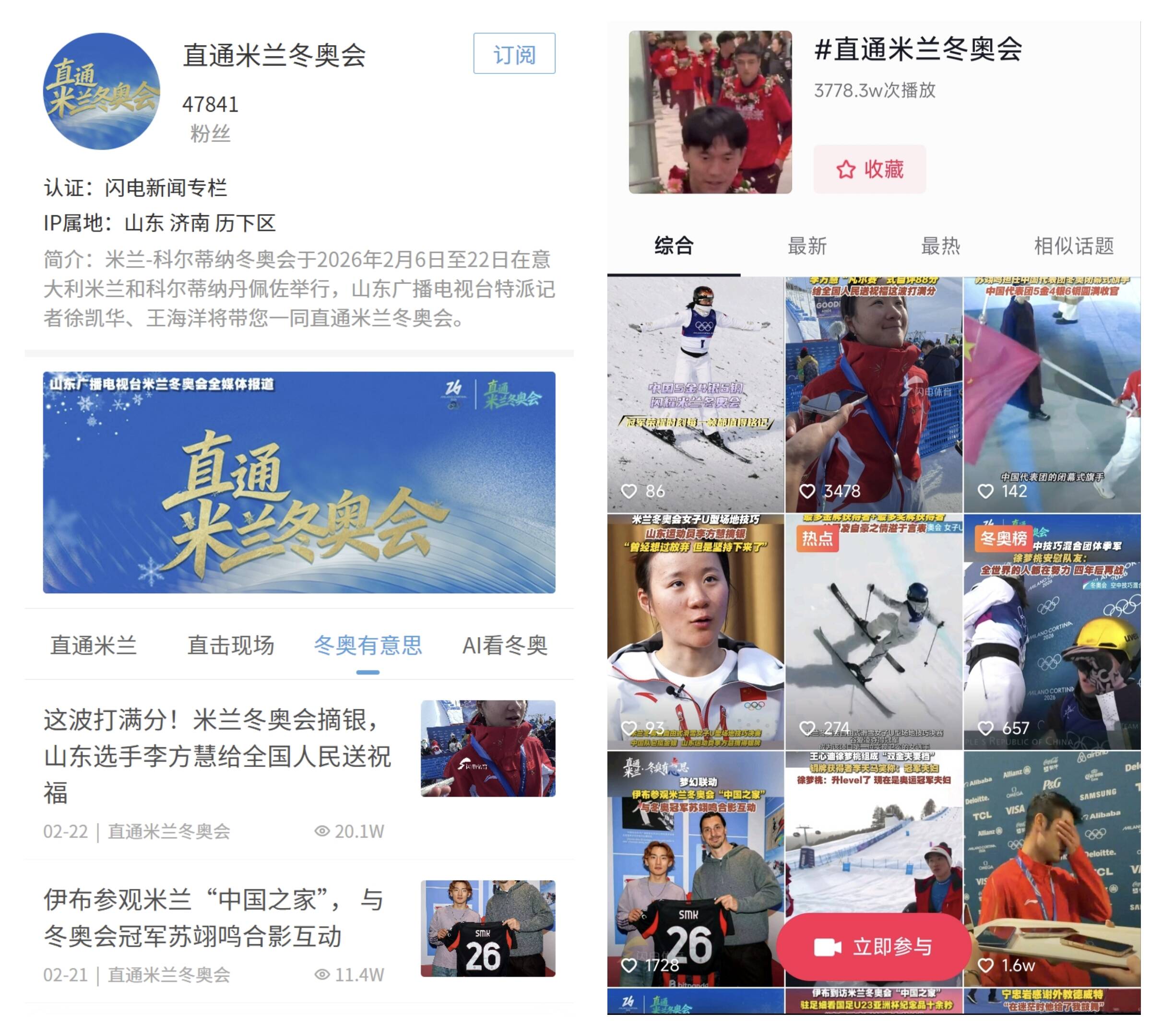 在本次冬奥会报道中,体育节目中心精心准备,在大、小屏同步开设《直通米兰冬奥会》专栏,立足闪电新闻客户端和齐鲁网,推出《直通冬奥》《冬奥有“意”思Vlog》等原创产品,构建多层次、立体化传播矩阵。