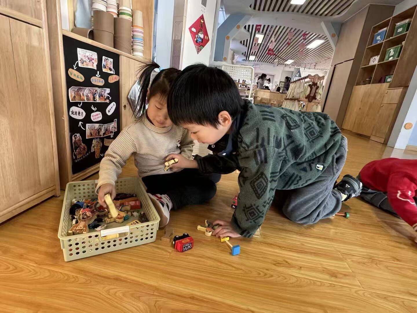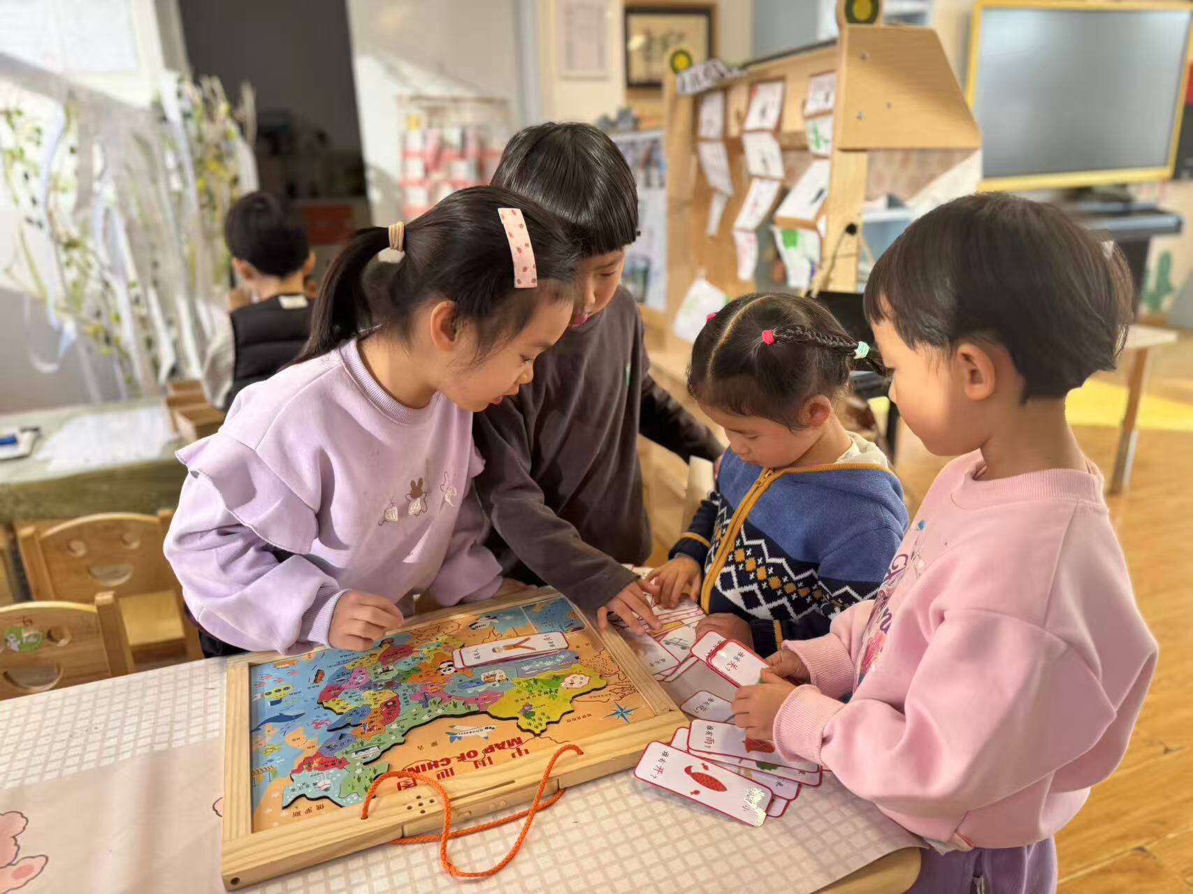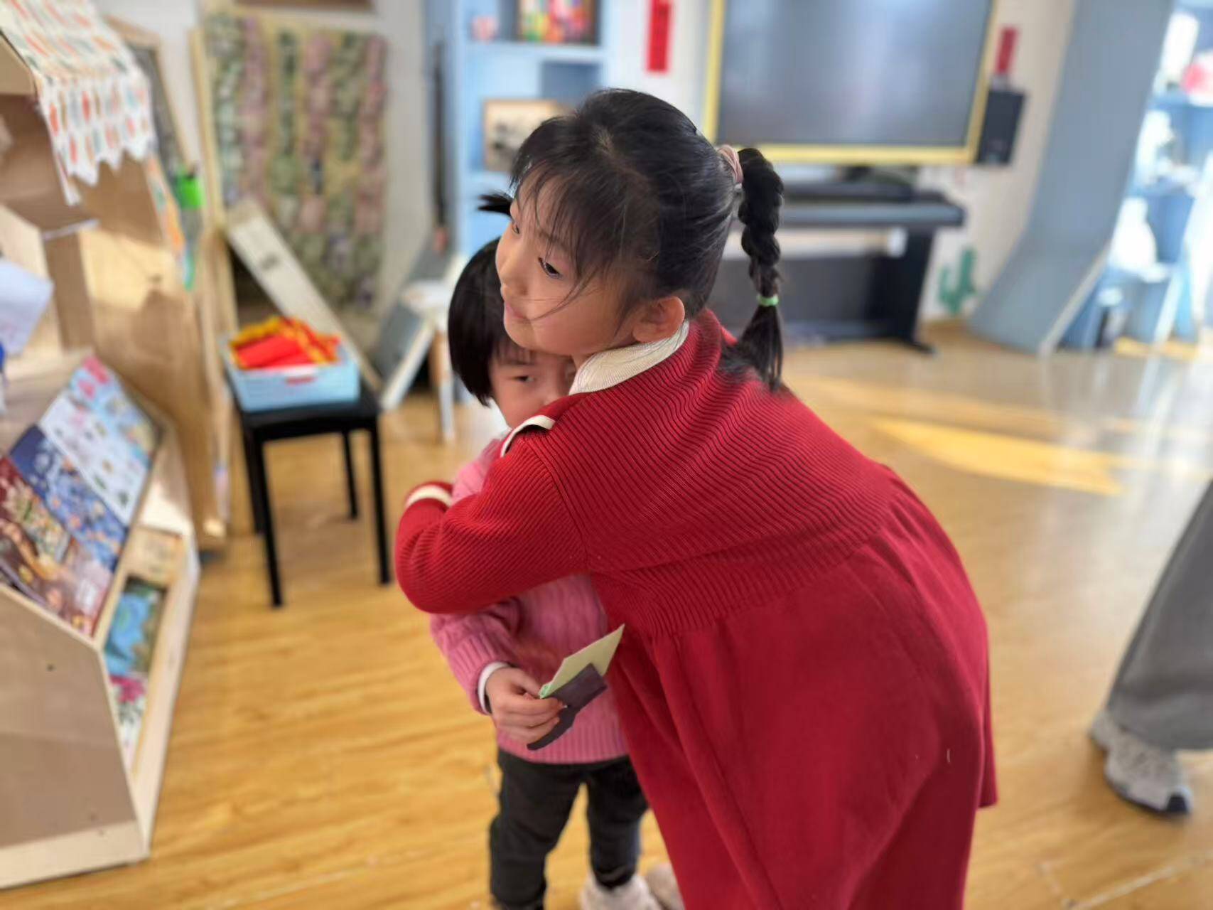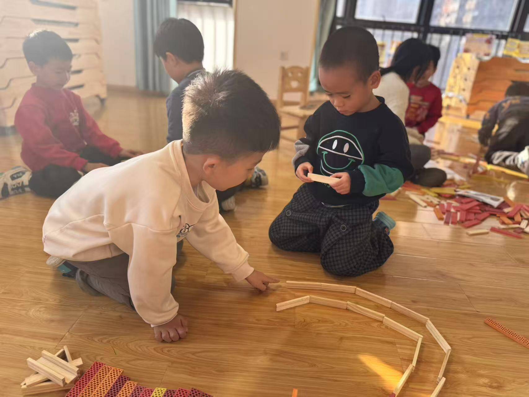 在建构区,哥哥们耐心地帮弟弟扶着积木,一步步搭建出“房子”;美工区里,姐姐们握着妹妹的小手,一起剪窗花、贴贴纸;益智区的拼图游戏最热闹,哥哥姐姐们手把手教弟弟妹妹找对应图案,当完整的拼图呈现时,孩子们脸上都露出了大大的笑容。