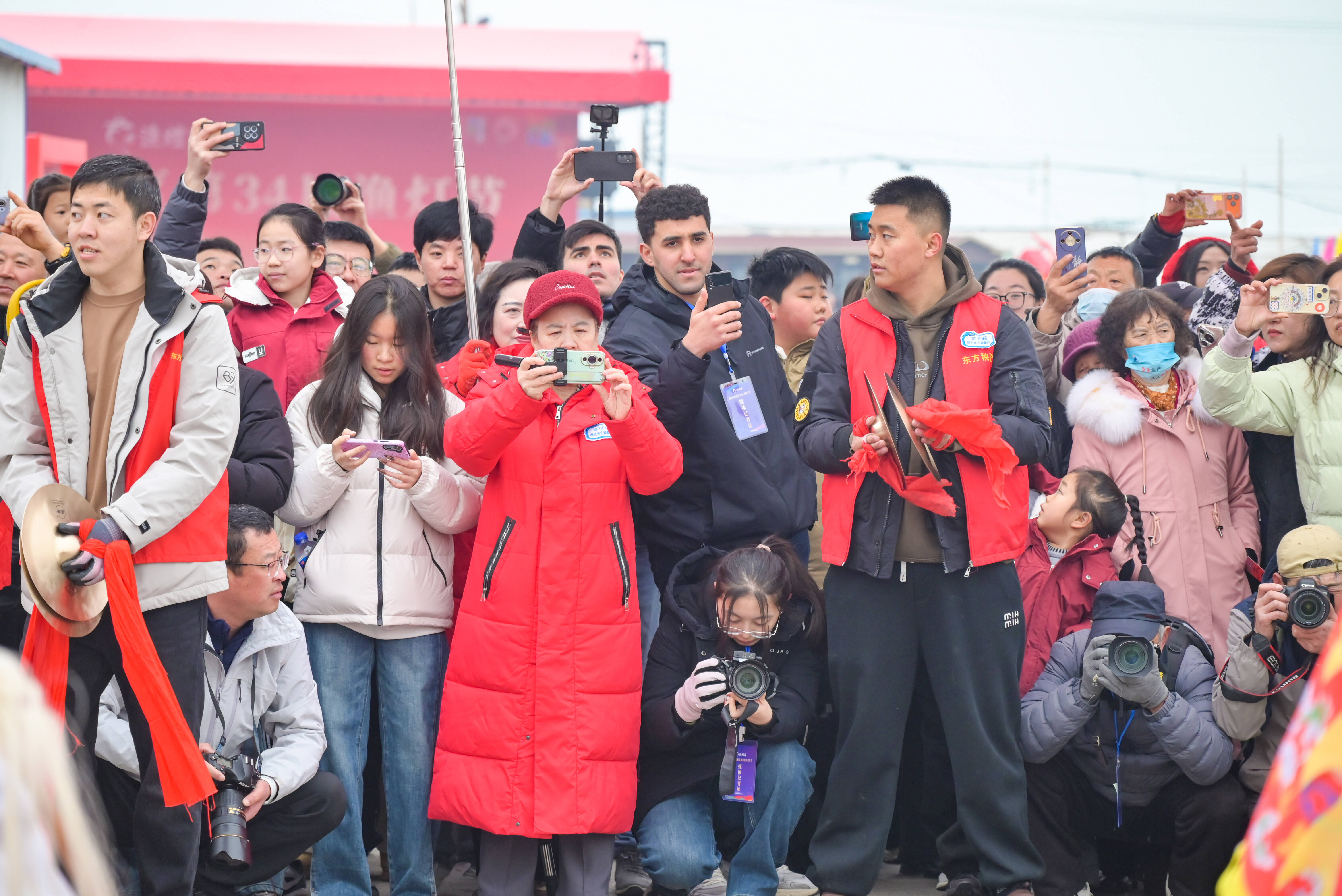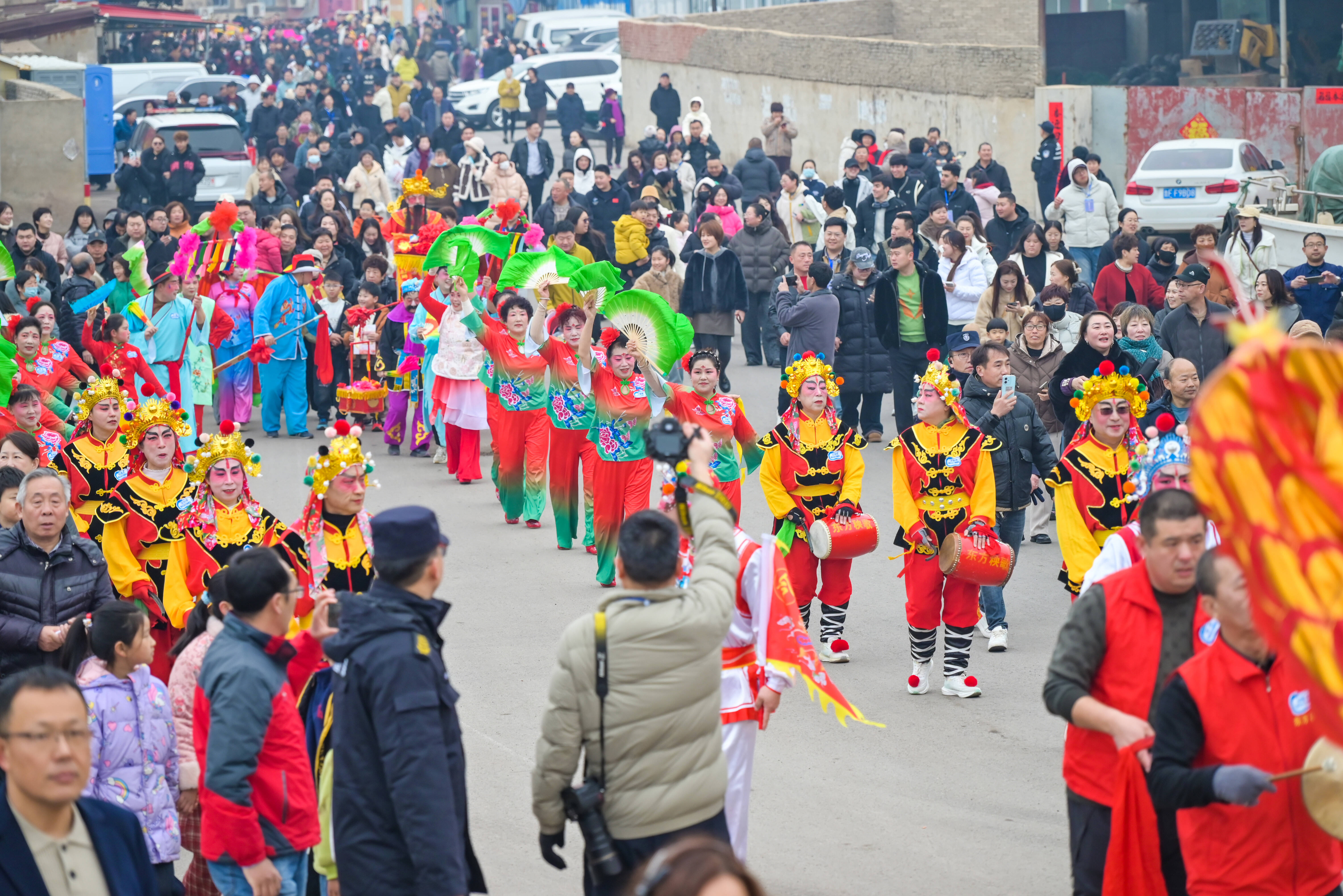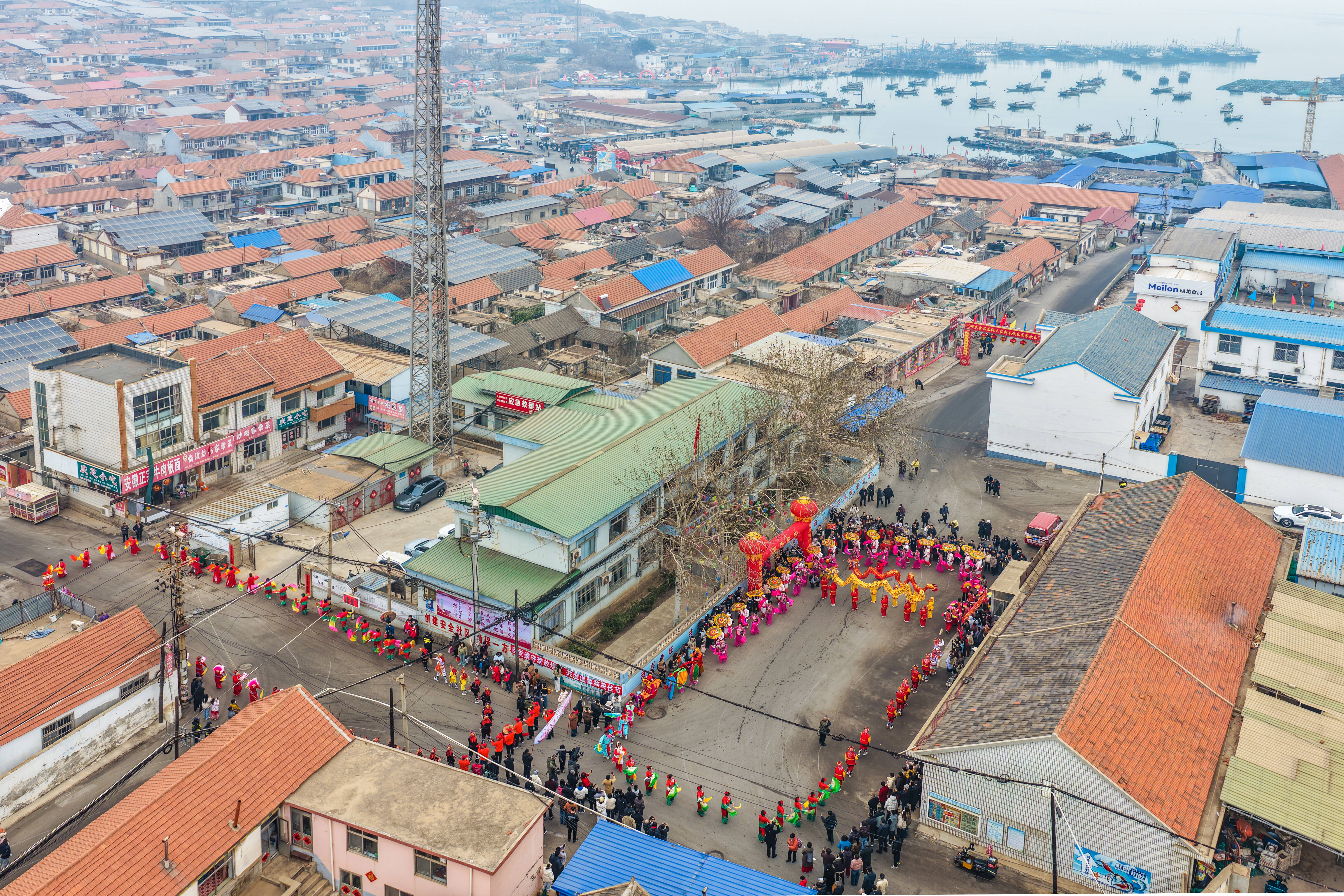 由海阳大秧歌、舞龙队、锣鼓队等80余人组成的巡游队伍,绵延百米,向码头行进。