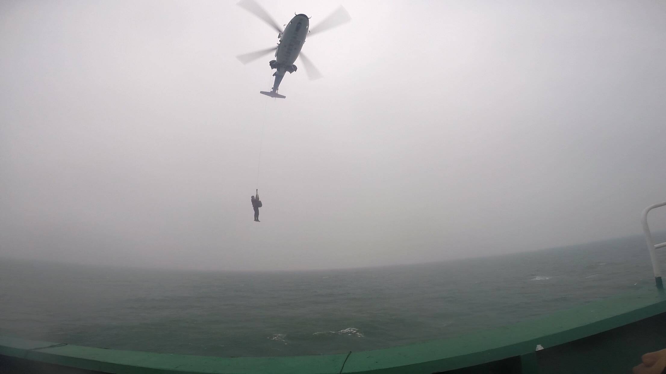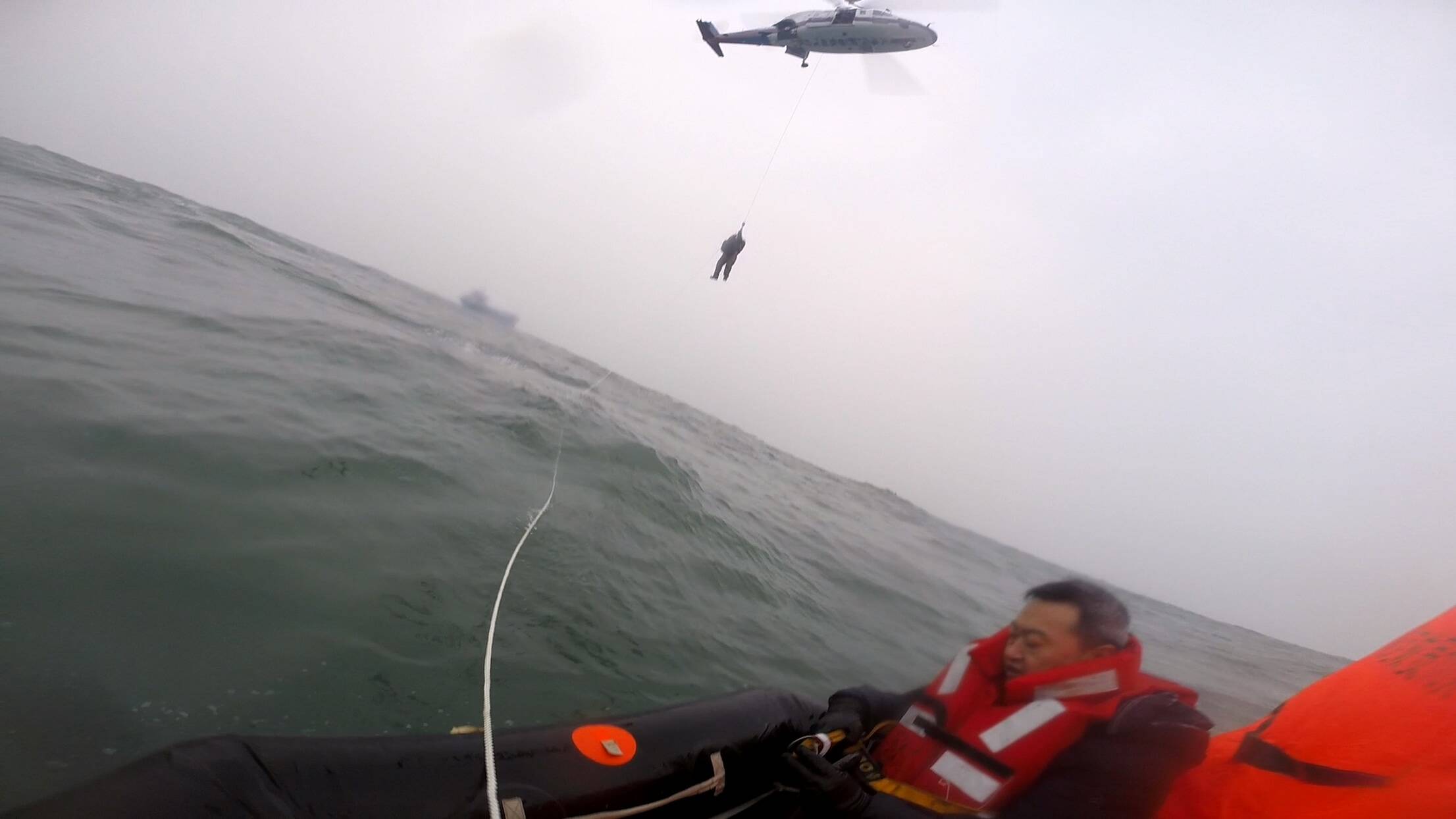 6时20分许,救助直升机和救助船舶先后抵达事发海域。救助人员凭借精湛的搜救技术和丰富的经验,快速锁定遇险船员乘坐的救生筏,并发现其与一艘过往货船连接,机组立即与该货船沟通,获悉2名船员已转移至该货船,另有6名船员在救生筏待救。因货船障碍物高大复杂,不利于直升机悬停救助,经现场协调,货船切断与救生筏连接绳,并保持一定距离。“B-7327”机组当即对救生筏和货船上的遇险船员展开救援。