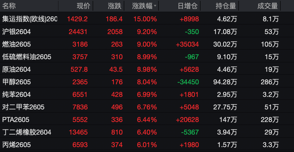 截至3月2日收盘,集运欧线、燃油、低硫燃料油(LU)、SC原油、甲醇、纯苯、丙烯、聚丙烯、液化石油气(LPG)、乙二醇(EG)主力合约均涨停,沪银、沪金等多个品种也同步走强。