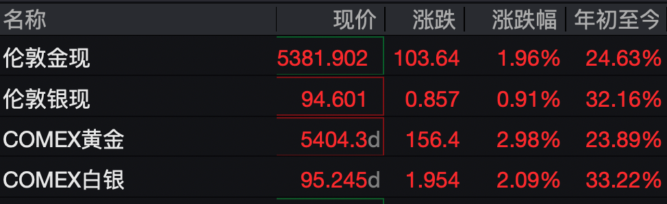 截至发稿,COMEX黄金报5404.3美元/盎司,涨2.98%;伦敦金现报5381.902美元/盎司,涨1.96%,最高摸至5400美元/盎司上方。现货白银涨0.91%,报94.601美元/盎司;COMEX白银报95.245美元/盎司,涨2.09%。