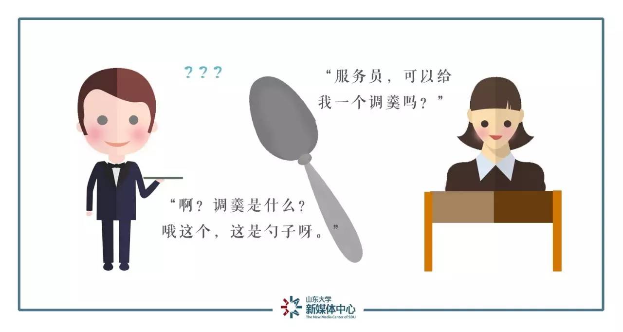 服务员:“啊?调羹是什么?哦这个,这是勺子呀。”