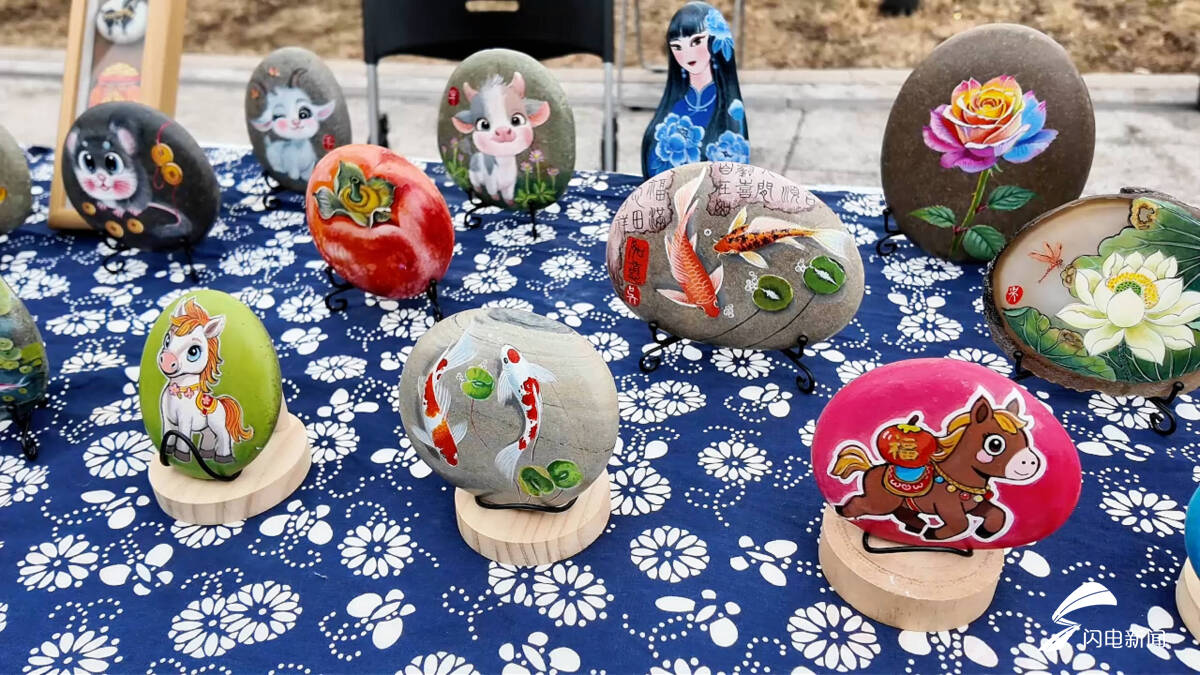 非遗市集上,日照市岚山嘉木石画艺术工作室主理人吴智玲也带着自己创作的石头画作品来到了活动现场,她表示,“我们要让更多的人了解石头画,了解非遗石画的魅力,让越来越多人喜欢上它。今天现场非常热闹,锣鼓喧天。虽然天气有点寒冷,但我们心里面非常开心、非常火热。”