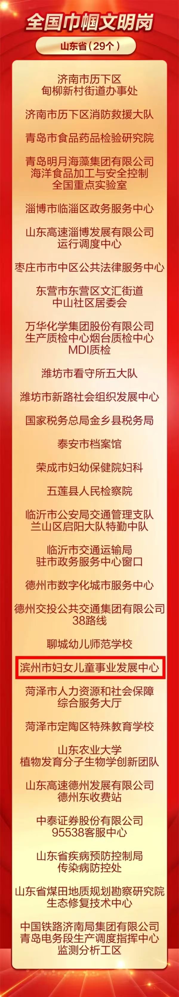 滨州市妇女儿童事业发展中心荣获“全国巾帼文明岗”称号。该中心女性占比超八成,成立全省首支美育“爱心妈妈”志愿服务队伍,承办2024全国“幸福联线”活动,成立全省首家市级12338妇联维权服务中心,并在全省妇联系统率先开设老年大学分校,年受益群众达5.5万人次,为妇女儿童事业高质量发展贡献了“滨州样本”。