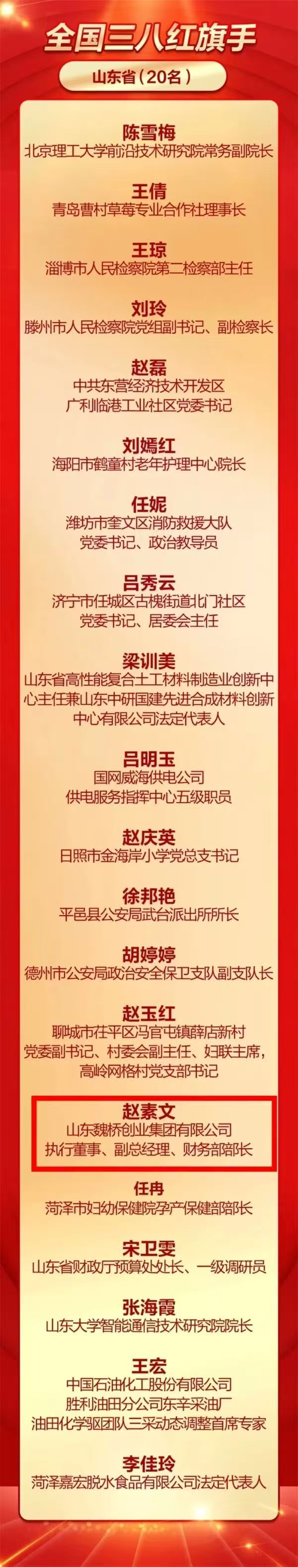 在此次表彰中,山东魏桥创业集团有限公司执行董事、副总经理、财务部部长赵素文荣获“全国三八红旗手”称号。作为企业财务掌舵人,她聚焦“创新魏桥”“数智魏桥”建设,带领团队建立覆盖全集团的数字化财务共享平台,以精细化管理和多元化融资渠道赋能企业高质量发展。同时,她积极履行社会责任,参与公益助学,切实为女工办实事解难事,曾获山东省三八红旗手、全国纺织工业劳动模范等称号。