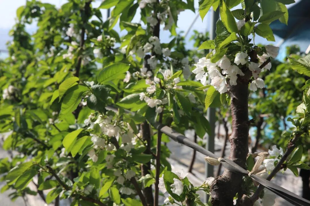棚内暖意融融,果农穿梭于花海之间,精心为樱桃树吹花、掐枝。“大棚的樱桃花已经全部授过粉了,现在用机器把弱花、密花吹掉,留下健壮的花,让养分更集中、坐果更稳。”果农谷大叔边说边干,“再就是把多余的枝掐掉,让果树长得更健壮,收成更好!”