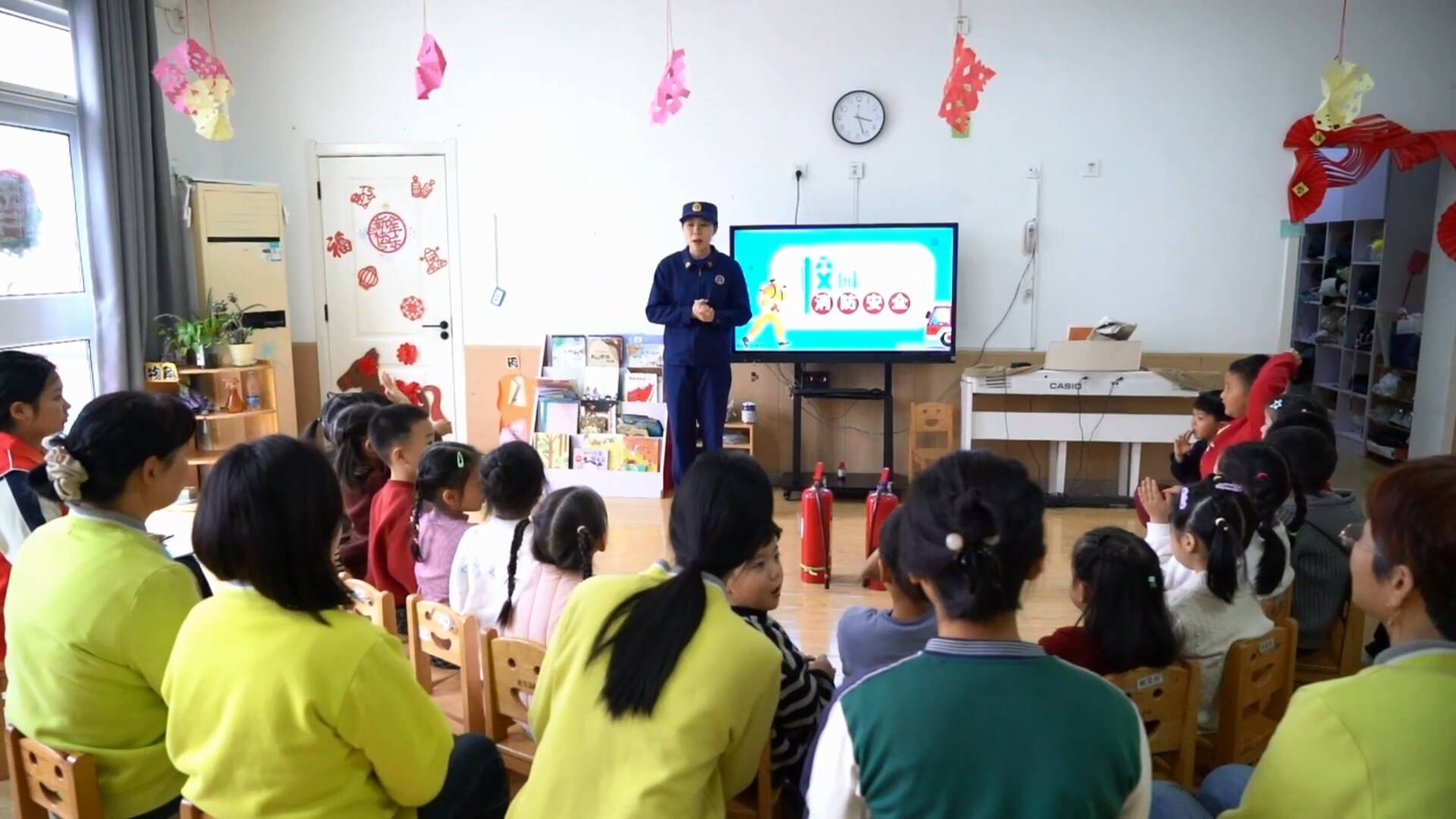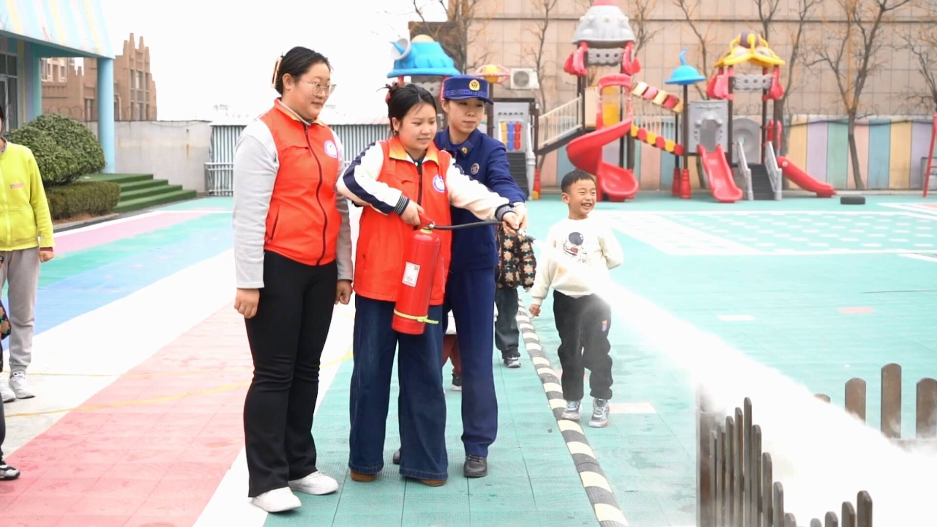 除了面向幼儿的科普和演练,消防宣传员还聚焦教职工这一校园安全“关键力量”,现场演示灭火器等消防器材的操作要领,手把手指导大家实操灭火,耐心解答各类疑问,确保每位教职工都能熟练掌握初起火灾扑救技能,真正把安全技能学到手、用得上。