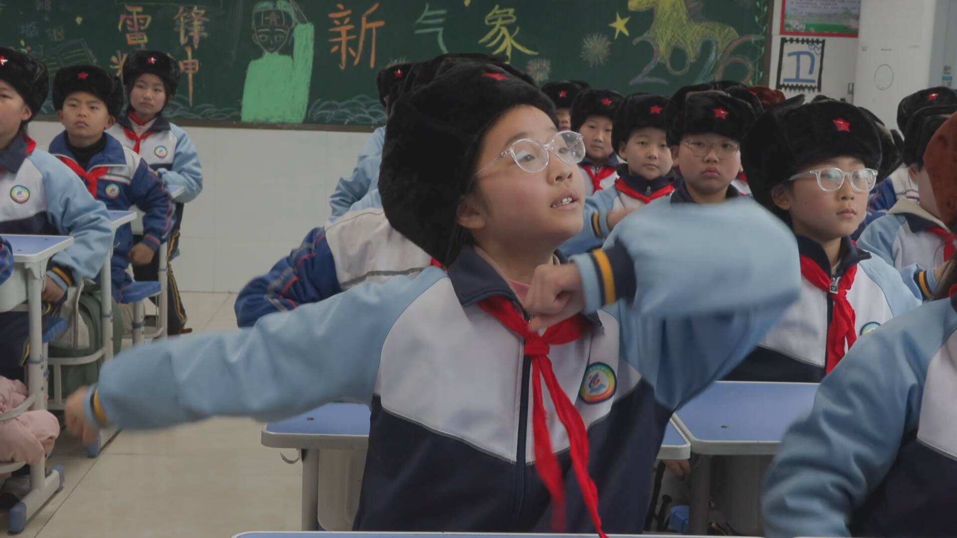 为了让雷锋精神更鲜活、更贴近孩子们,班级还专门编排了雷锋主题手势舞。活动现场,同学们头戴雷锋帽,以整齐划一、灵动有力的手势,用满满的少年朝气致敬雷锋、传承精神。