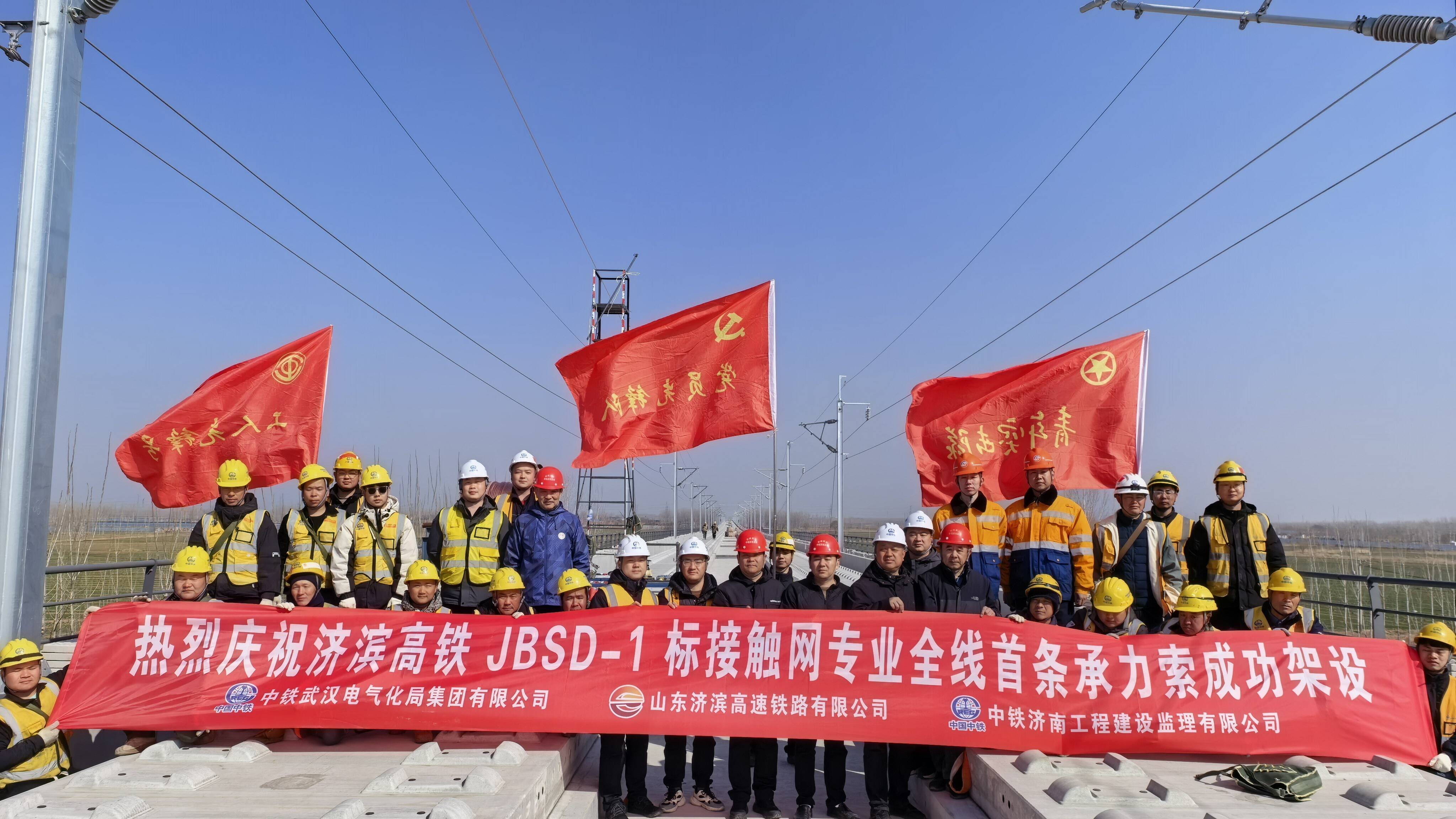 全线首条承力索的成功架设,为后续接触导线架设、冷滑热滑试验、全线静态验收及联调联试等关键节点工作创造了有利条件,标志着济滨高铁电气化施工进入加速推进阶段。