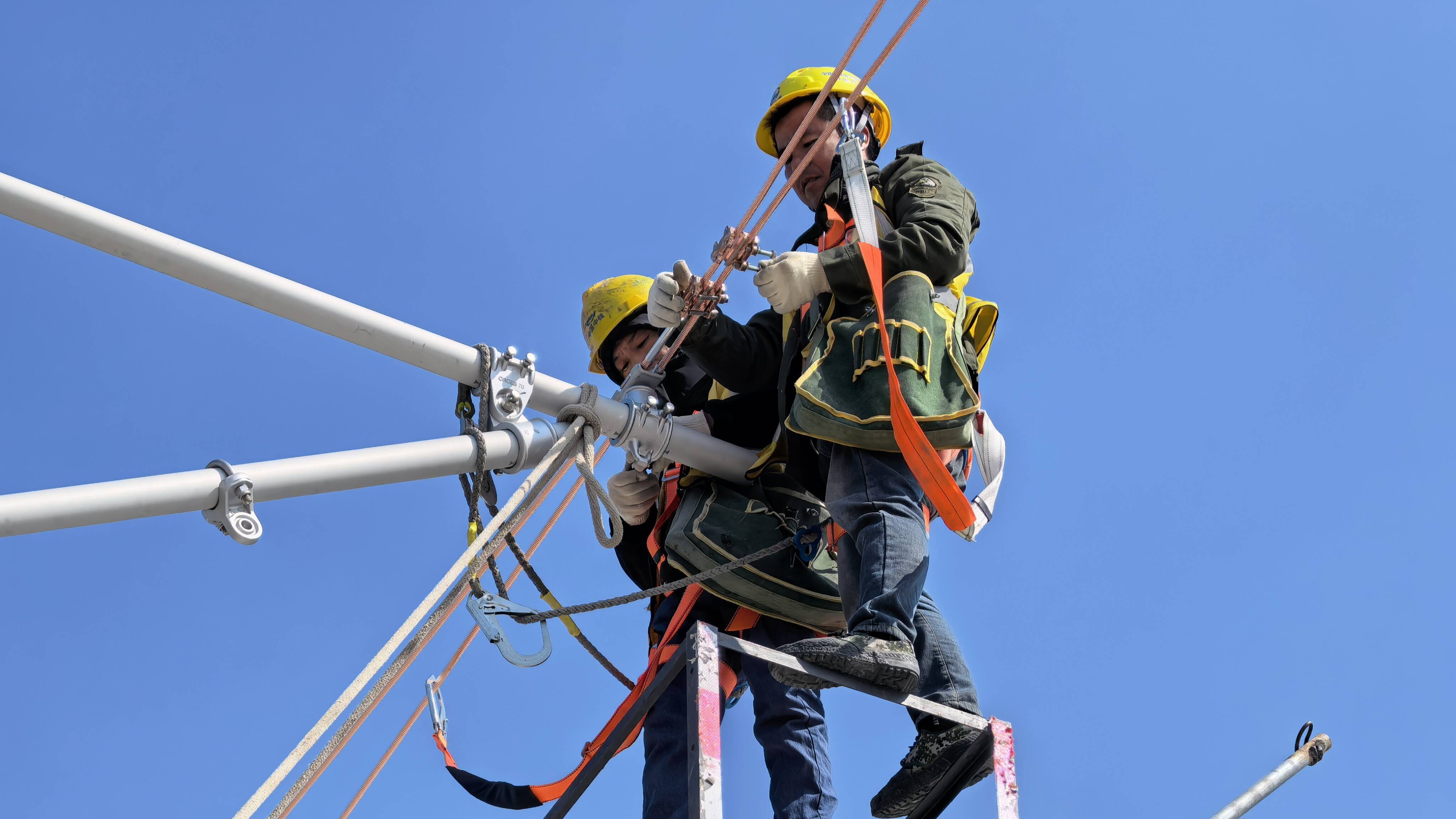 为确保首条承力索顺利架设,项目部提前谋划、周密部署,对施工组织、安全防护、技术标准等进行系统安排。施工过程中,作业人员严格执行标准化作业流程,使用公司自主研发的实用新型无砟轨道防倾倒梯车进行施工,有效提升了作业安全性和架设精度,确保各项技术指标符合规范要求。