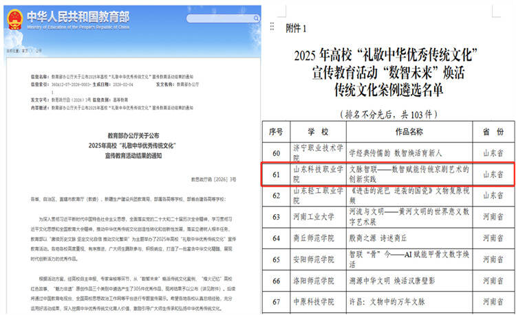 齐鲁网·闪电新闻3月10日讯 近日,教育部正式公布了2025年高校“礼敬中华优秀传统文化”宣传教育活动结果。山东科技职业学院提报的案例《文脉智联——数智赋能传统京剧艺术的创新实践》从全国众多参评项目中脱颖而出,成功入选“数智未来”焕活传统文化类作品遴选名单,标志着学校在推动中华优秀传统文化创造性转化、创新性发展方面取得重要突破。