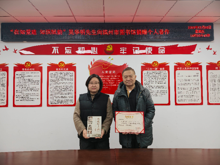 滨州日报/滨州网讯 近日,吴华明先生向滨州市图书馆捐赠个人著作《北镇印记》第三辑两册,市图接受捐赠,并向吴先生颁发捐赠证书。