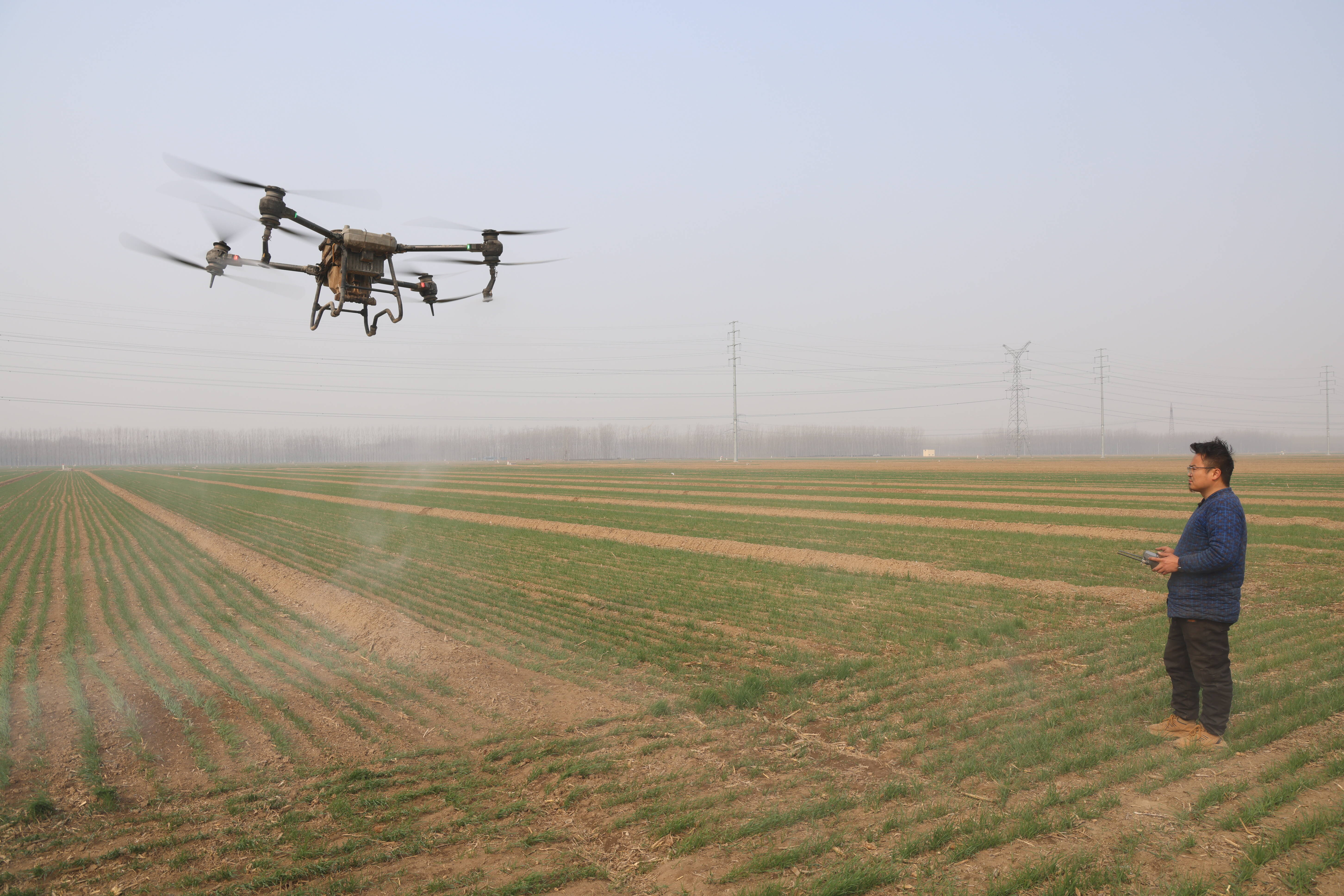 齐鲁网·闪电新闻3月12日讯 3月11日,邹平市韩店镇大白村农田里,农民操作植保无人机进行喷药作业。眼下正值小麦返青管护期,当地农民抢抓农时,强化麦田科技管理,利用植保无人机、自走式高杆喷雾机对小麦进行田间管理作业,提高春管效率,促进稳产增收。通讯员 霍广 毕文丽 报道