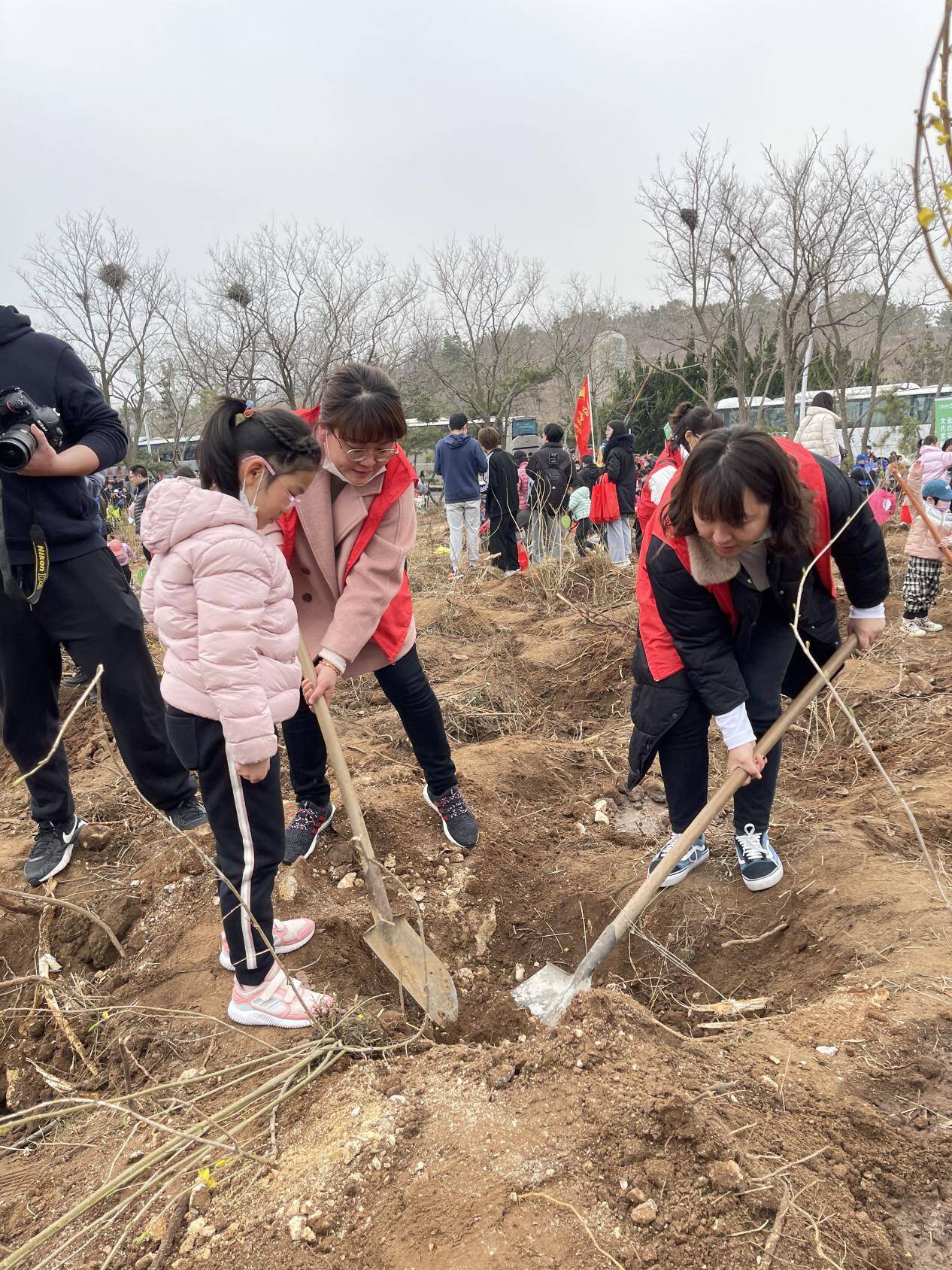 在烟台,植树活动恰逢某小学的孩子们也来参加劳动。烟台联通的青年志愿者们热情地邀请小朋友们加入队伍,手把手教他们挥锹挖坑、扶苗填土。大小朋友携手劳动,稚嫩的脸上满是认真与喜悦,在欢声笑语中共同增强了“植绿、护绿、爱绿”的生态文明意识。