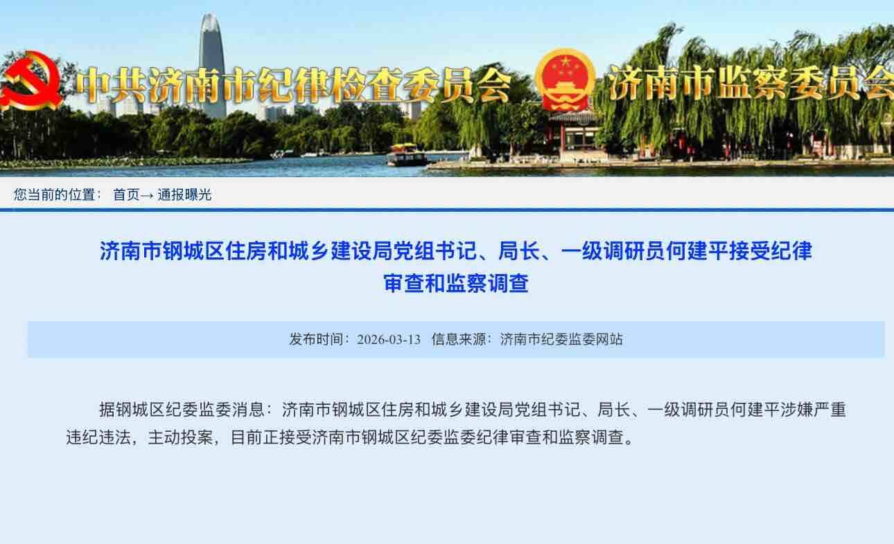 齐鲁网·闪电新闻3月13日讯 据济南市钢城区纪委监委消息:济南市钢城区住房和城乡建设局党组书记、局长、一级调研员何建平涉嫌严重违纪违法,主动投案,目前正接受济南市钢城区纪委监委纪律审查和监察调查。