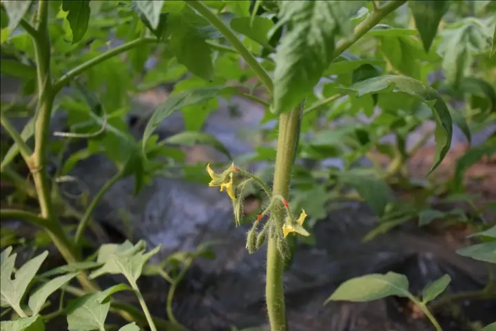 走进产业园的大棚里,一股温暖湿润的气息扑面而来,层层叠叠的叶片间,朵朵嫩黄色的西红柿花缀满枝头、竞相绽放,俯身贴近,阵阵清香沁人心脾。整齐的垄沟里,工人们手持授粉工具蘸粉、涂抹,小心翼翼地为每一朵小花完成人工授粉,确保每一朵花都能顺利坐果、茁壮成长。