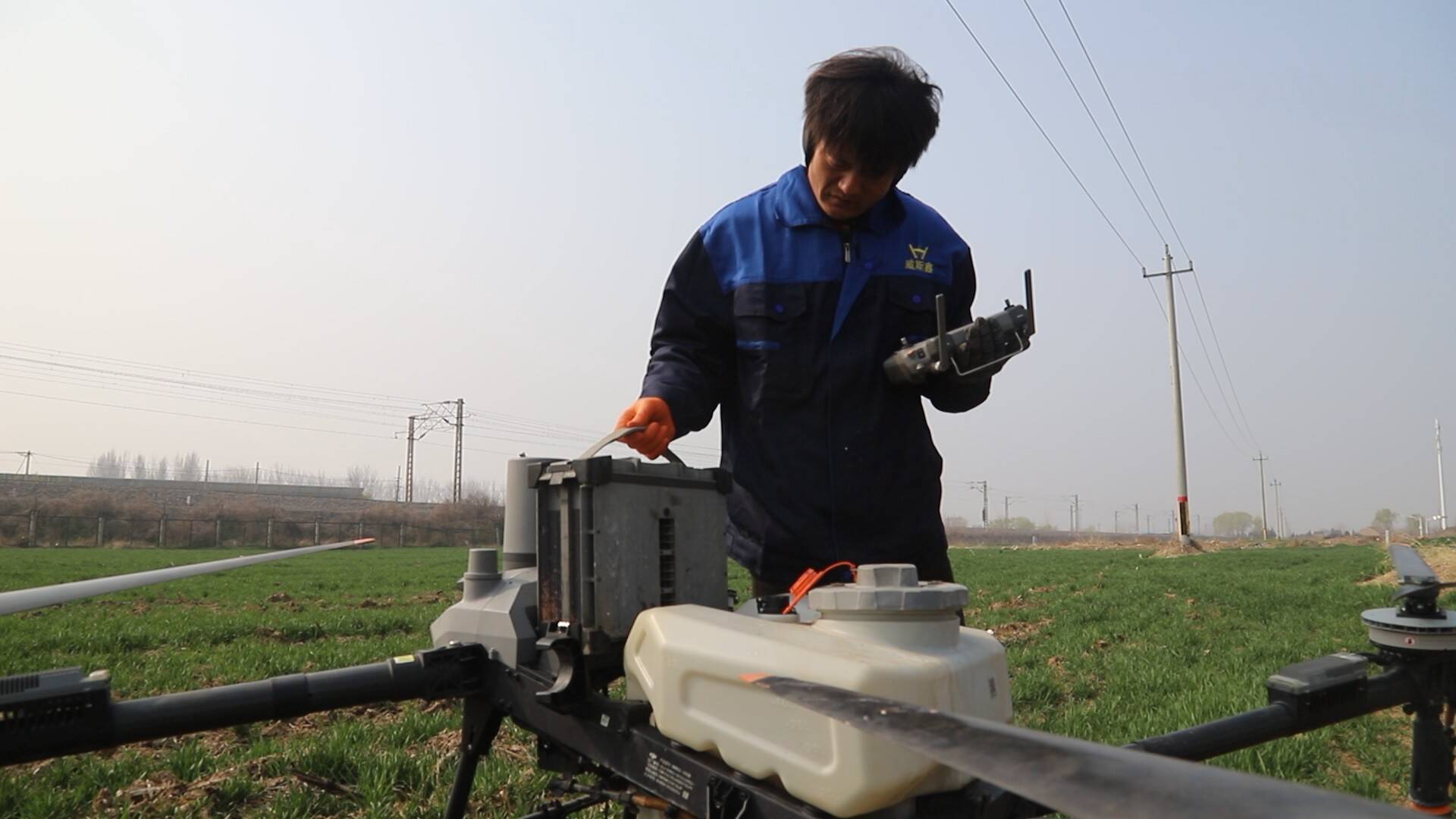 在现场,无人机装满农药和植物调节剂,随着机手的操纵,它腾空而起,沿着预设航线匀速飞行,将调配好的药剂均匀雾化喷洒在麦苗上,展现出一幅美丽的画面。