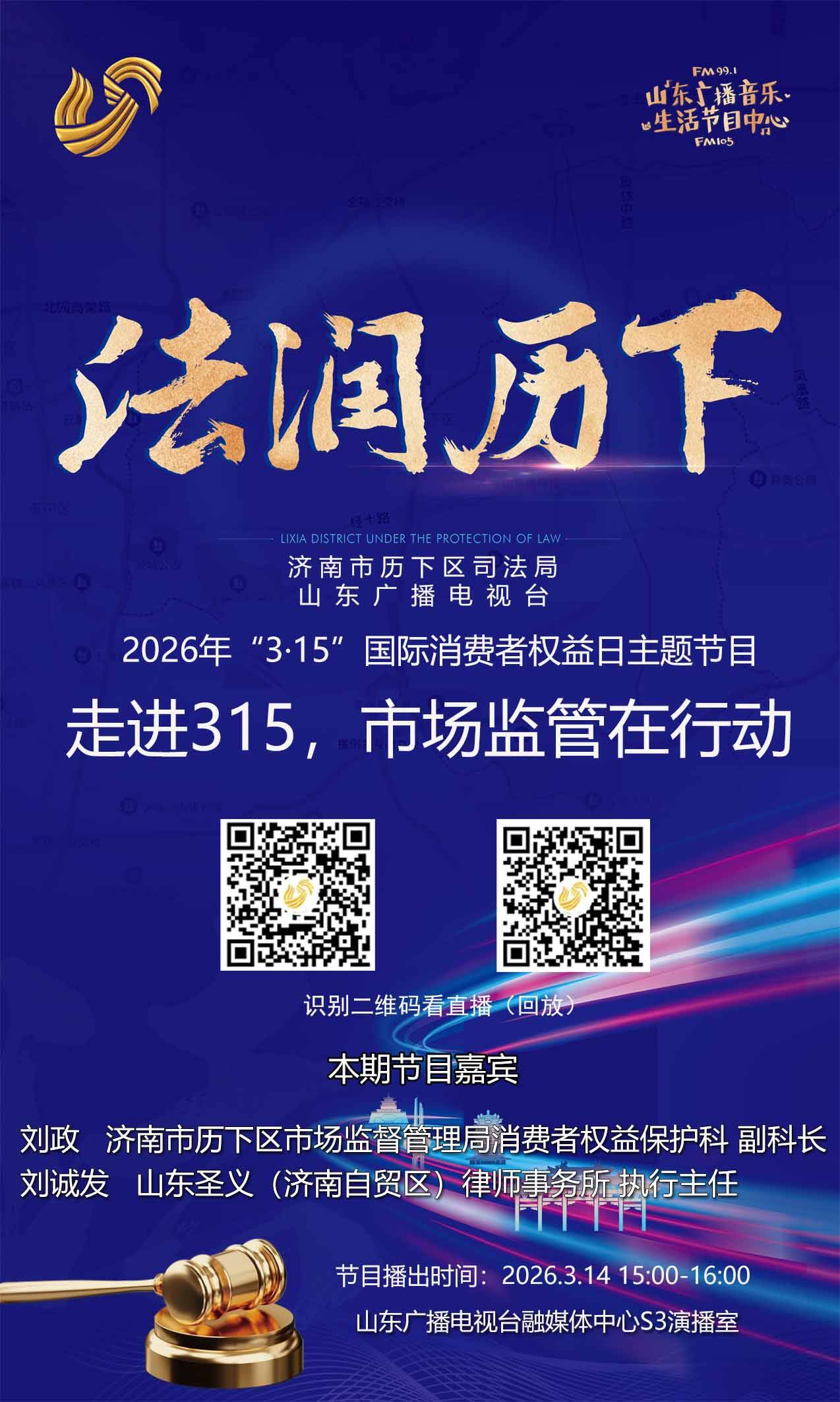 在2026年国际消费者权益日来临之际,由济南市历下区司法局与山东广播电视台联合制作的融媒体普法节目《法润历下》推出专题直播,以“走进315 市场监管在行动”为主题,邀请历下区市场监督管理局消费者权益保护科副科长刘政、山东圣义(济南自贸区)律师事务所执行主任刘诚发律师,围绕预付式消费、网络购物、食品安全等热点问题,结合真实案例展开普法解读,为消费者送上实用维权指南与健康消费提示。