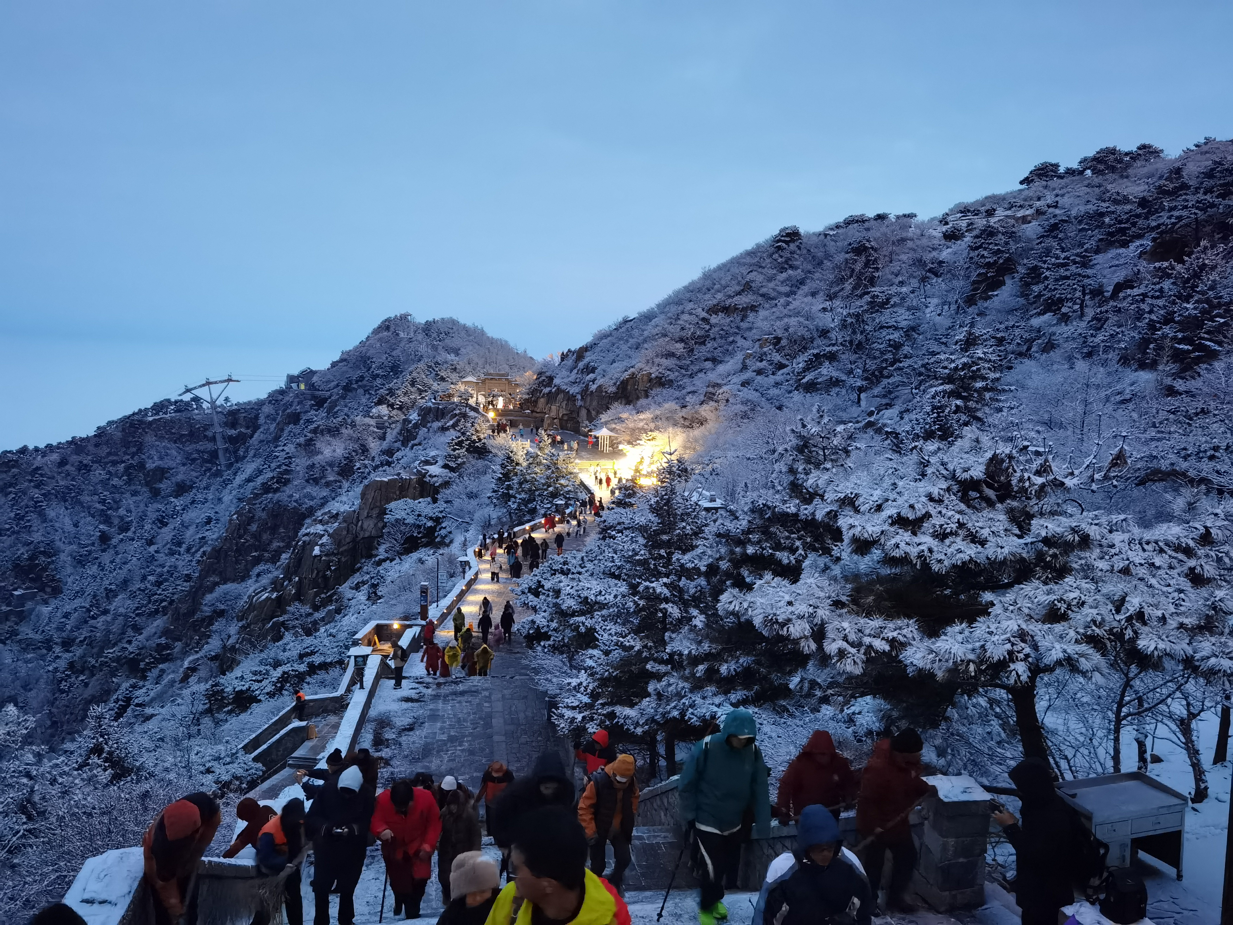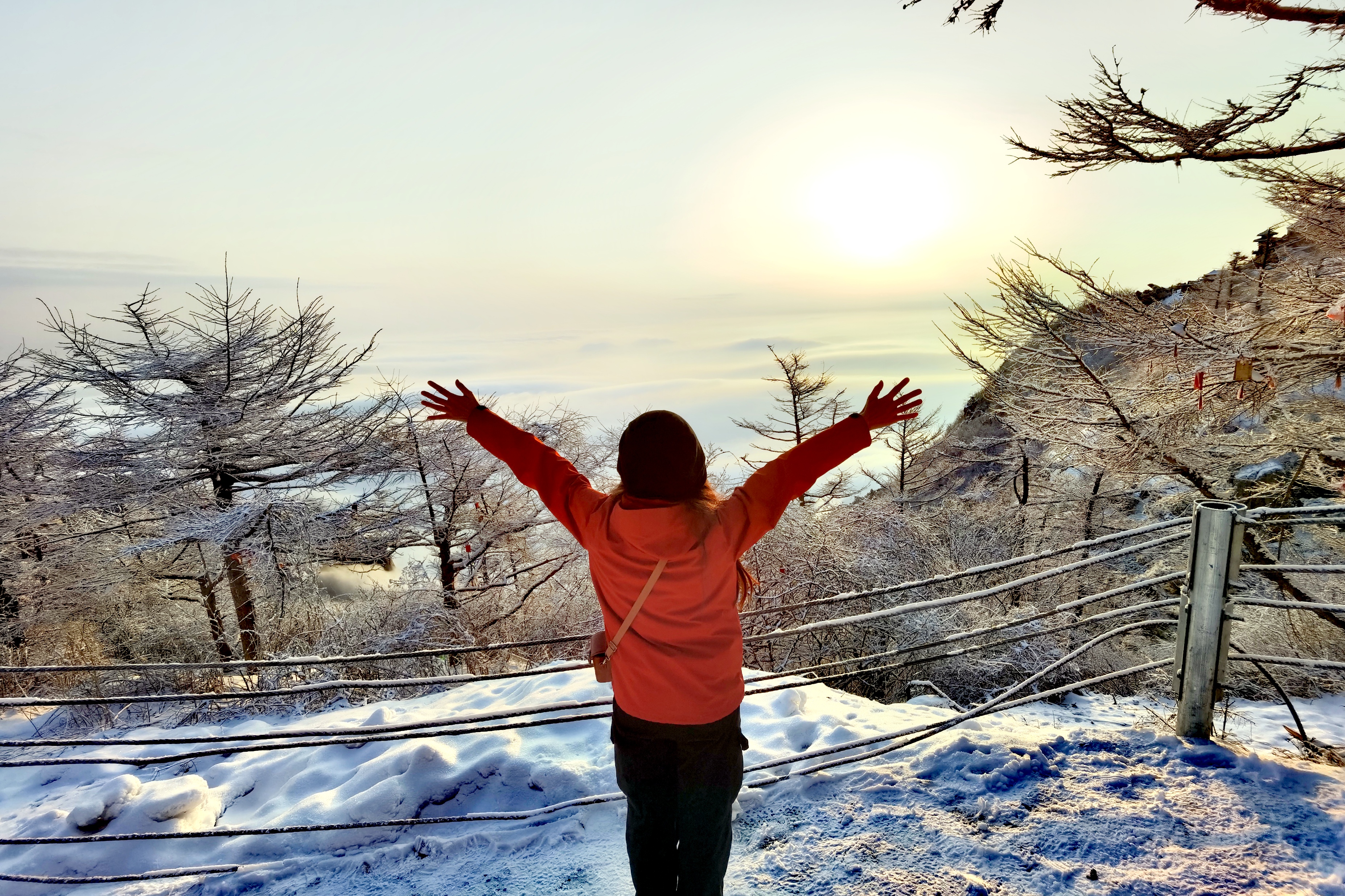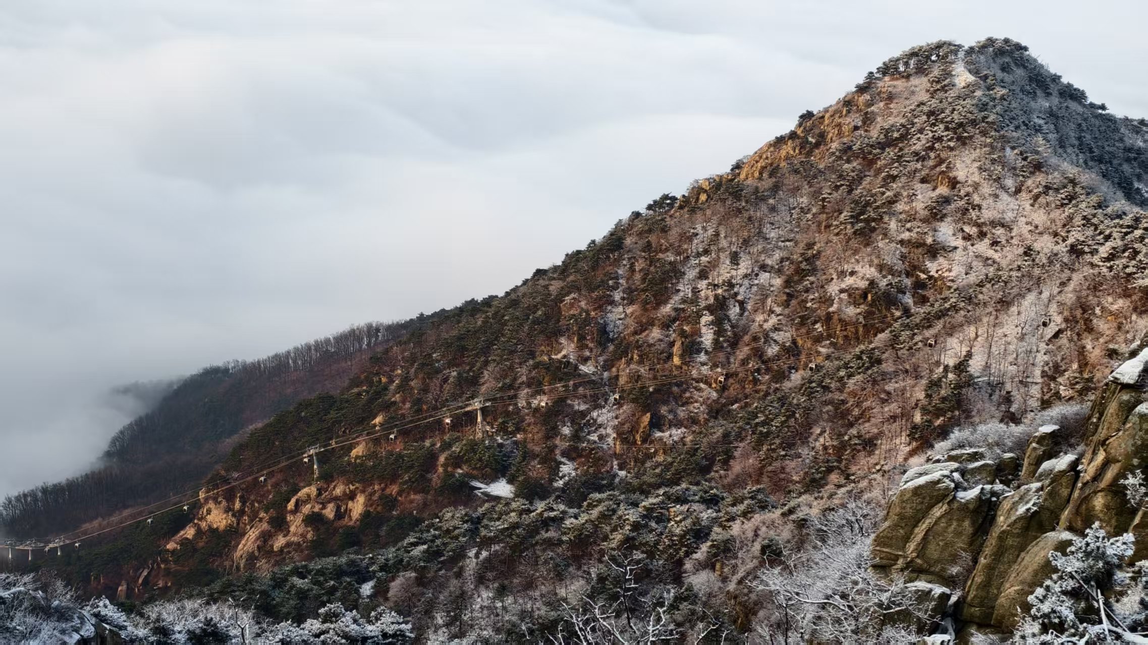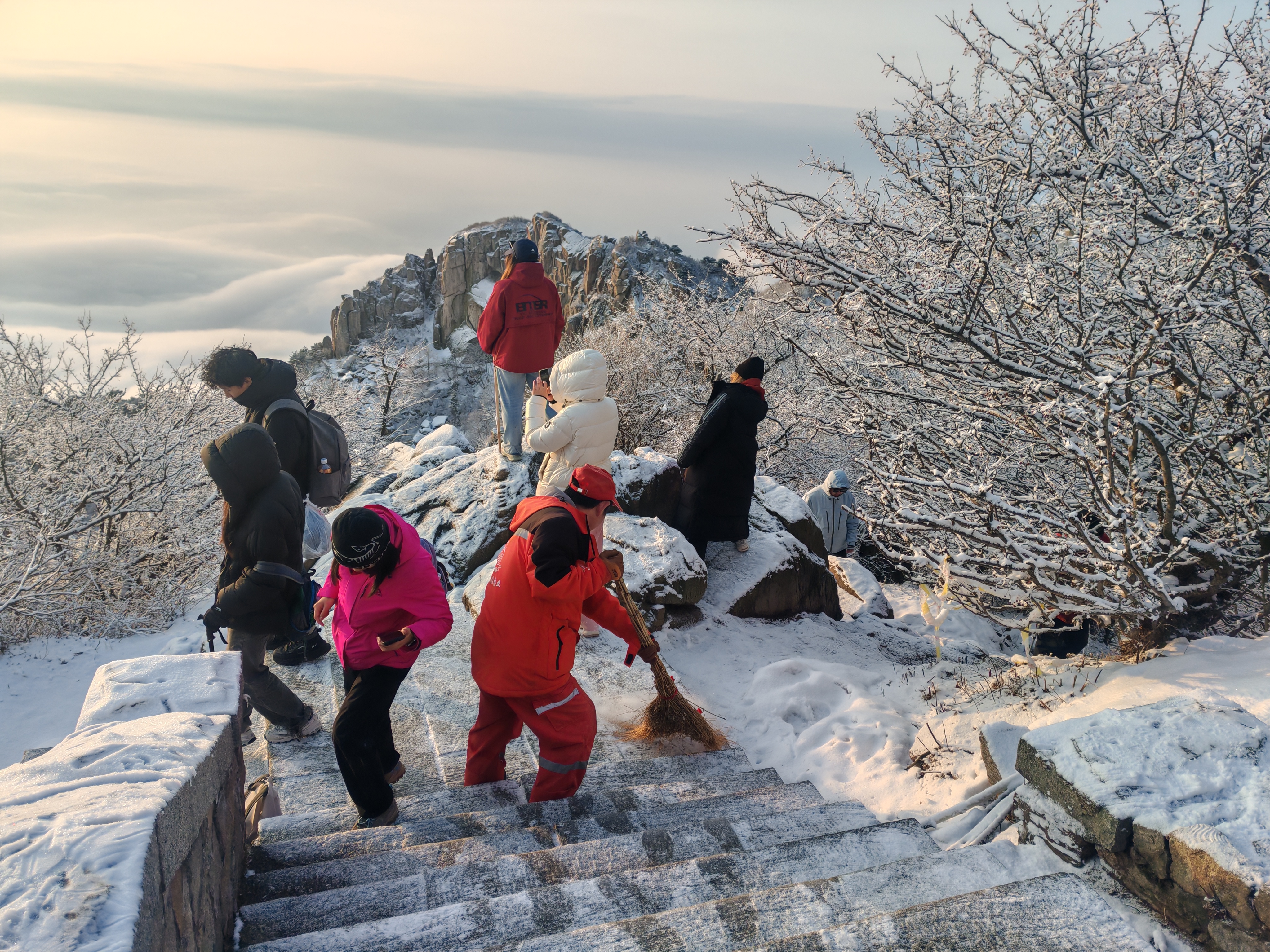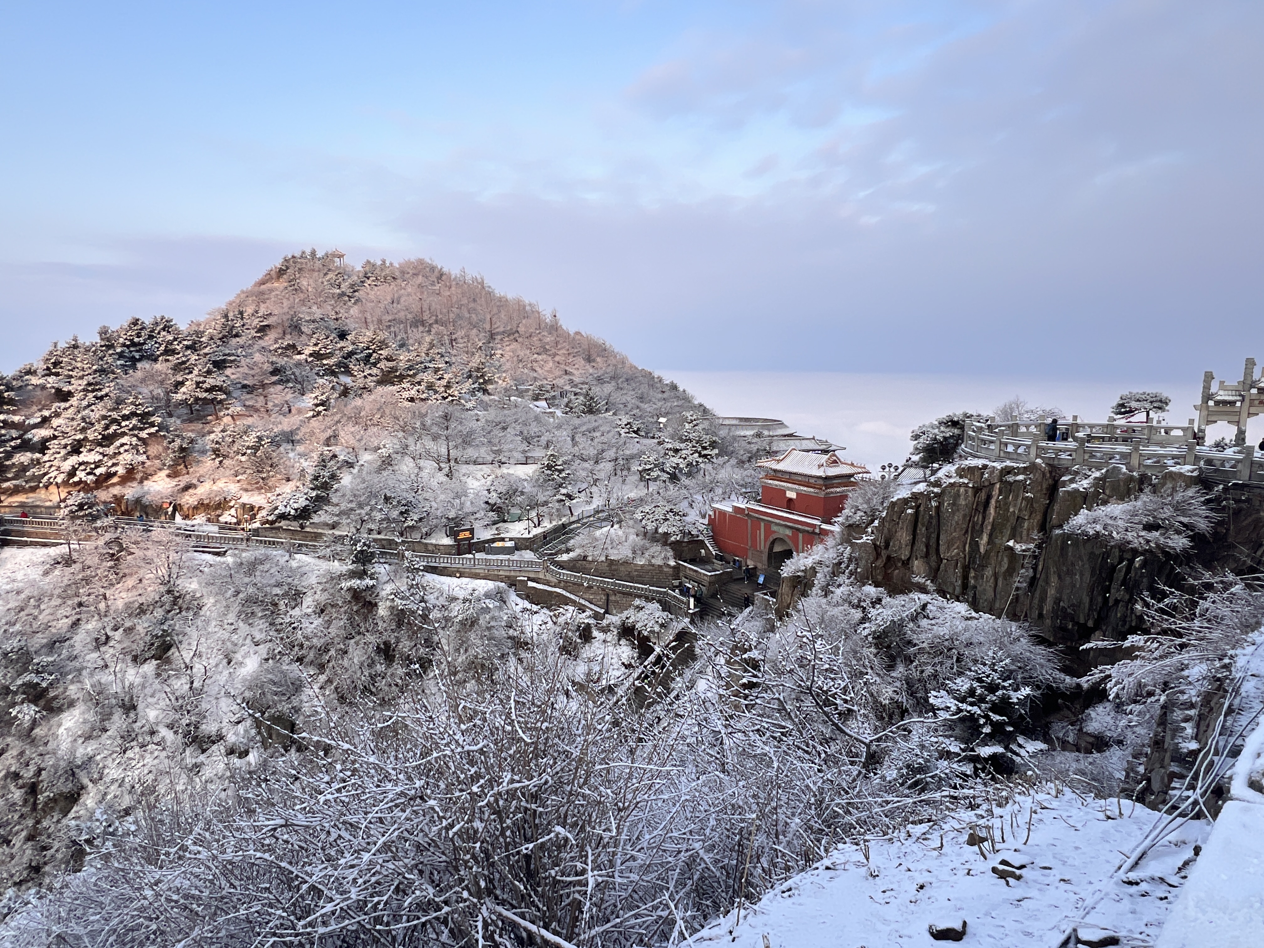 岱顶被皑皑白雪覆盖,古建筑群在雪中更显庄严肃穆,松枝挂雪,雾凇晶莹,构成一幅天然水墨画卷。登高远眺,云雾自山谷翻涌而上,将群峰揽入怀中,时而漫过石阶,时而缠绕檐角,与古建相映成趣,宛若水墨长卷。日出时分,旭日破云,金光洒落,云海翻涌成浪,更添壮丽。