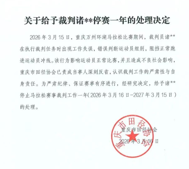 据人民体育3月17日消息:3月15日,2026重庆万州环湖马拉松赛事现场出现裁判工作失误。男子全马冠军选手盛雪李在冲线前遭现场裁判错误拦截推搡,这一事件引发全网热议。3月16日,重庆市田径协会发布官方处罚公告,对涉事裁判作出停止马拉松赛事裁判工作一年的处罚,禁赛期限自2026年3月16日起至2027年3月15日止。