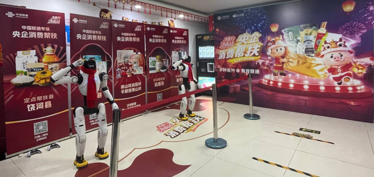 3月13日中午,在山东联通济南分公司职工餐厅门口,两个智能机器人舞动迎宾,拉开了山东联通“央企消费帮扶”齐鲁行(济南站)暨乡村振兴志愿服务活动的序幕。“央企消费帮扶齐鲁行”是山东联通打造的乡村振兴消费帮扶品牌,作为集团央企消费帮扶活动重要补充,重点推广集团定点帮扶县及山东联通定点帮扶村的农产品。本次活动以“消费帮扶齐鲁行,联通助农暖人心”为主题,创新融合消费帮扶、美食品鉴、文化娱乐三大形式,让广大员工在沉浸式体验中参与助农行动,以联通力量为乡村振兴注入温暖动能。