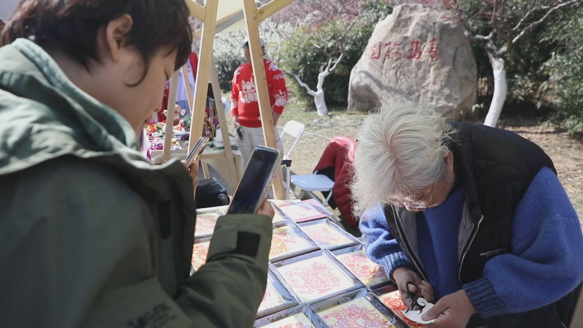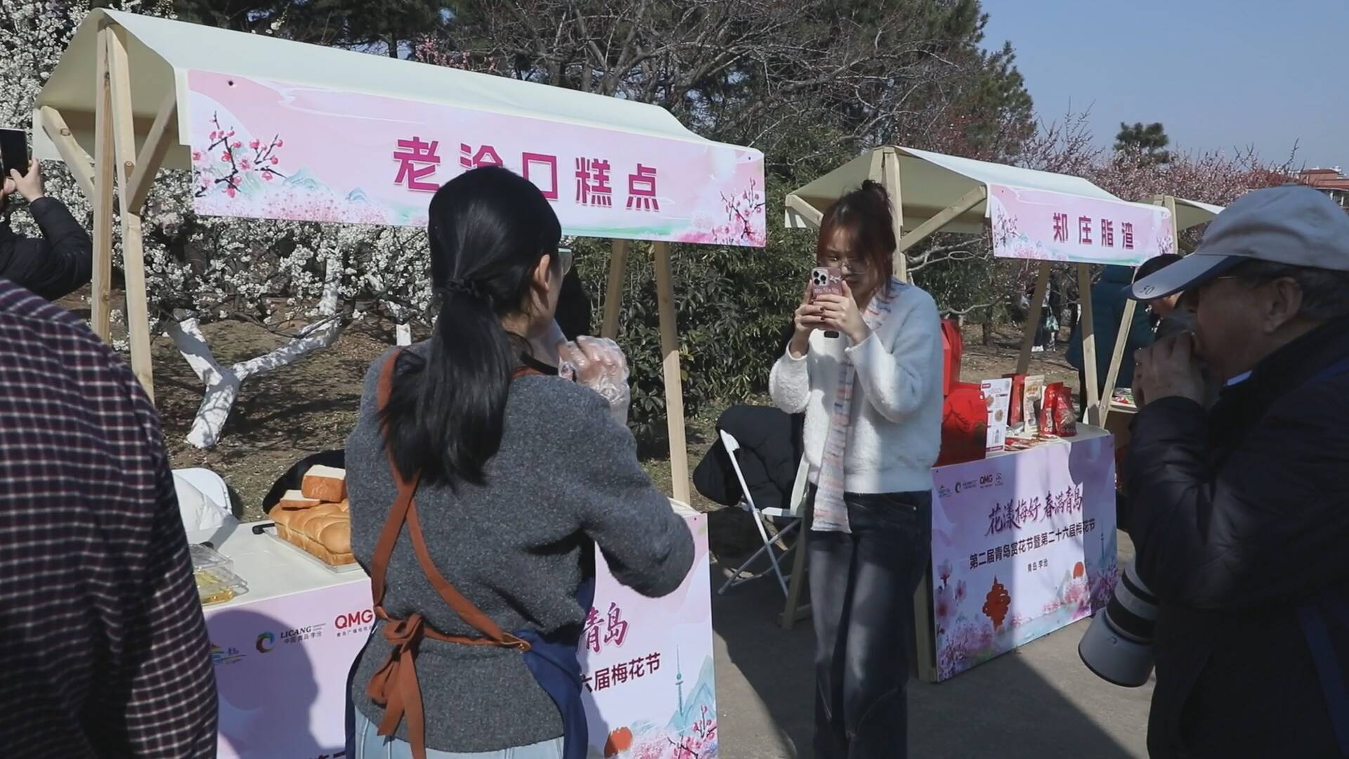 花如海,人如潮。如果说花景留住的是脚步,那么今年梅花节特别打造的“花间集市”,则真正留住了游客的心。原本单一赏花的“走马观花”正被沉浸式的文化体验所取代。崂山九段烘焙茶的茶香与梅花暗香交织,李氏剪纸艺人巧手翻飞剪出梅花形态;程式吹糖人摊位前围满好奇的孩子,郑庄脂渣和老沧口糕点则聚拢起品尝“青岛味道”的游客。