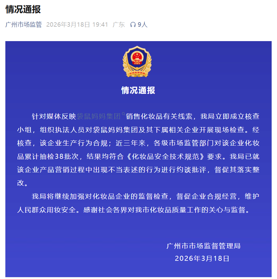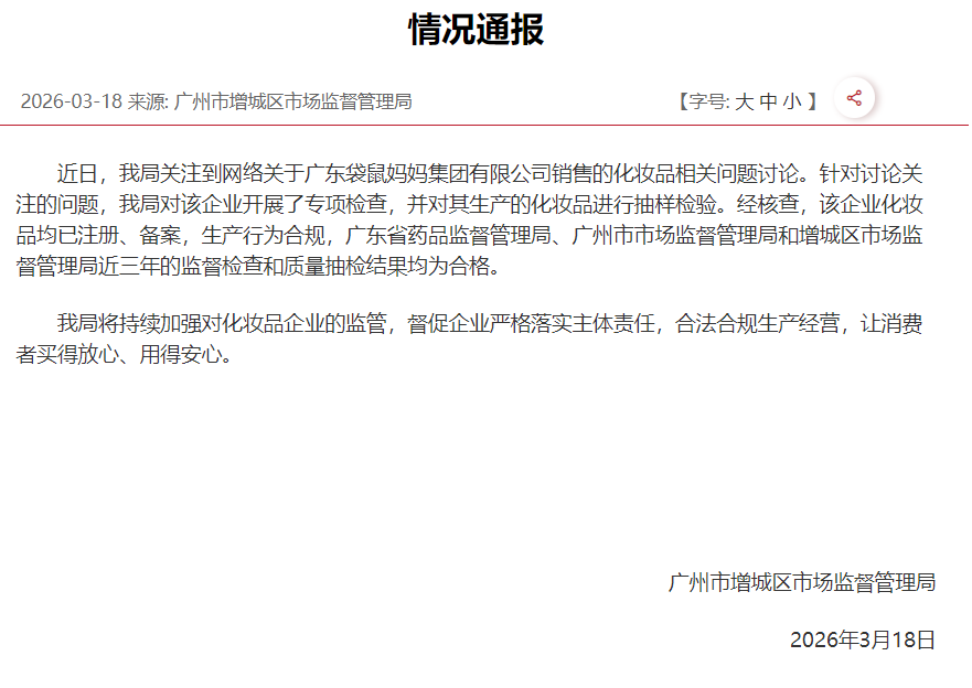 同一天,增城区市场监督管理局也发布了一则情况通报,通报内容则没有提及“产品营销过程中出现不当表述的行为”,而是表示:近日,我局关注到网络关于广东袋鼠妈妈集团有限公司销售的化妆品相关问题讨论。针对讨论关注的问题,我局对该企业开展了专项检查,并对其生产的化妆品进行抽样检验。经核查,该企业化妆品均已注册、备案,生产行为合规,广东省药品监督管理局、广州市市场监督管理局和增城区市场监督管理局近三年的监督检查和质量抽检结果均为合格。我局将持续加强对化妆品企业的监管,督促企业严格落实主体责任,合法合规生产经营,让消费者买得放心、用得安心。