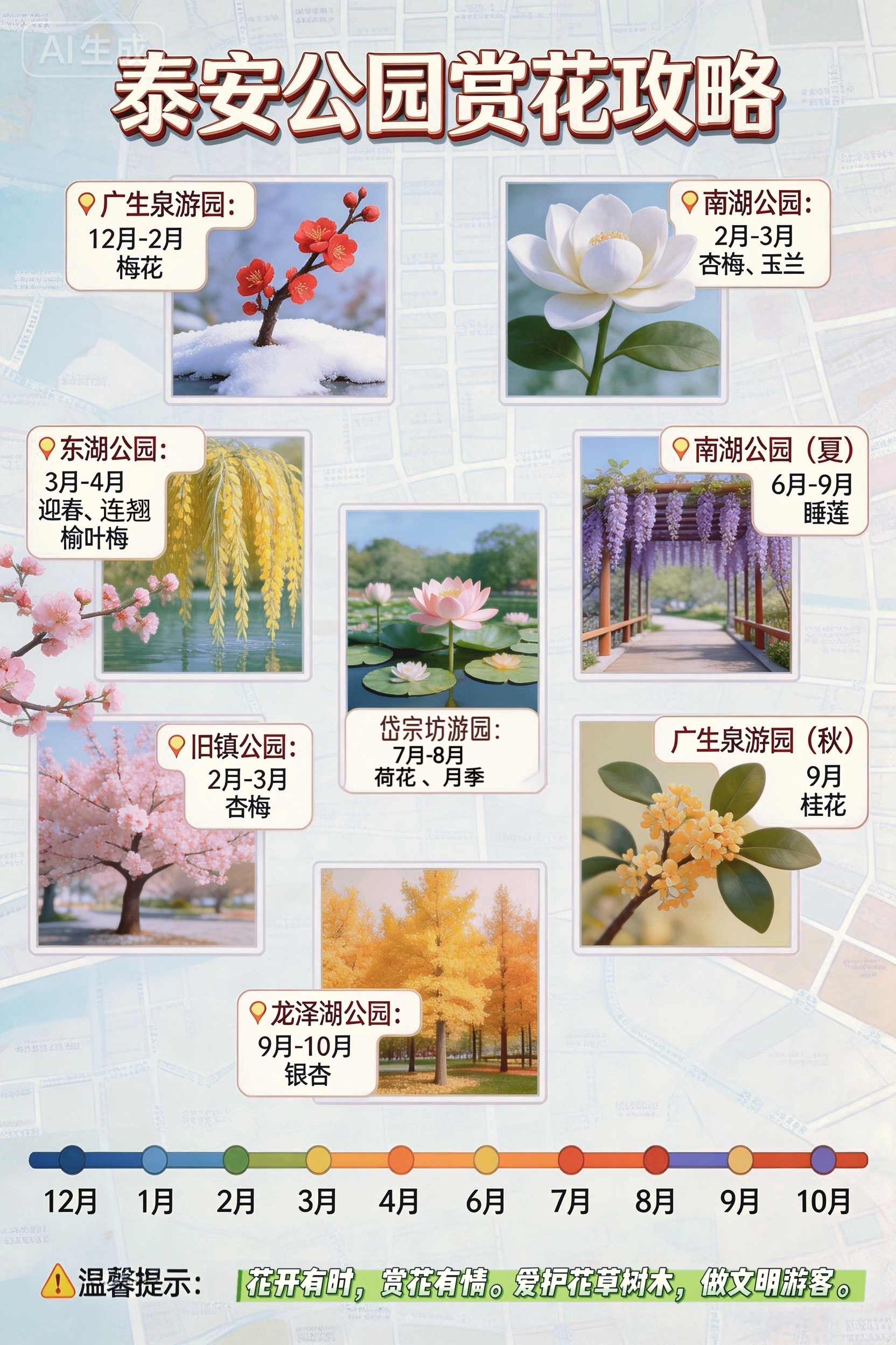 为了方便市民直观规划行程,我们根据上述内容为您绘制了一份“泰安公游园赏花地图”视觉概念图: