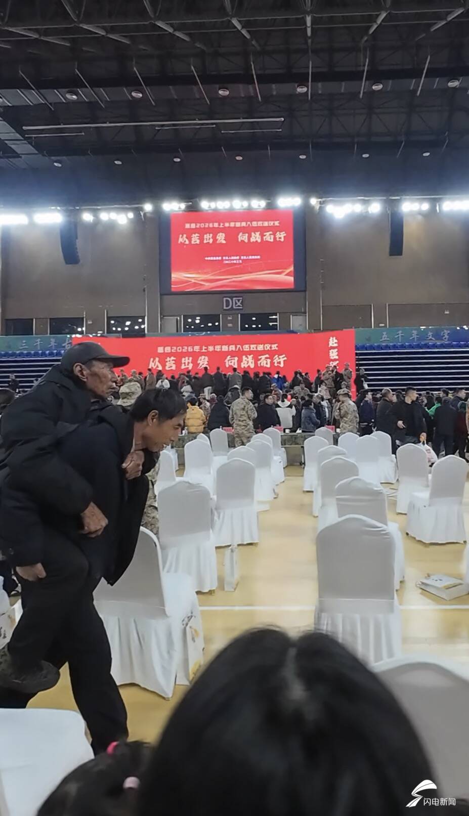 齐鲁网·闪电新闻3月19日讯 3月18日,日照市莒县举办“从莒出发 向战而行”莒县2026年上半年新兵入伍欢送仪式,现场有一抹身影感染了在场的所有人。 新兵欢送仪式结束后,爸爸背着爷爷一路小跑去见入伍的孙子,见到孙子后,爸爸放下腿脚不便的爷爷,爷爷看到孙子后满眼泪花,内心充满不舍与骄傲。
