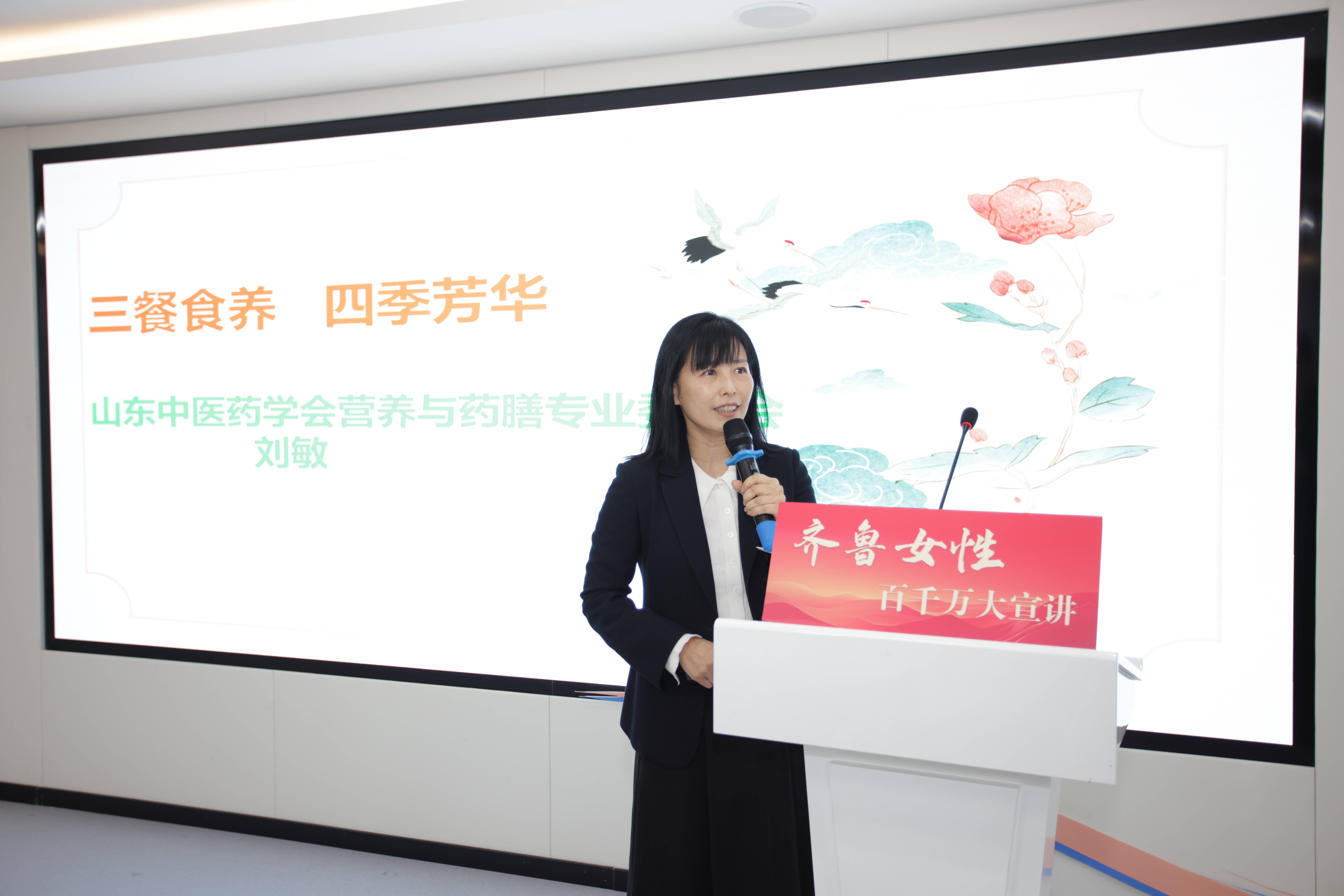 山东中医药学会营养与药膳专业委员会主任委员刘敏以《三餐食养 四季芳华》为题带来女性健康知识讲座。她结合《中国居民膳食指南》与中医养生理念,用通俗易懂的语言为现场女性定制科学的膳食与健康方案,以专业营养知识守护新业态女性的身心健康。