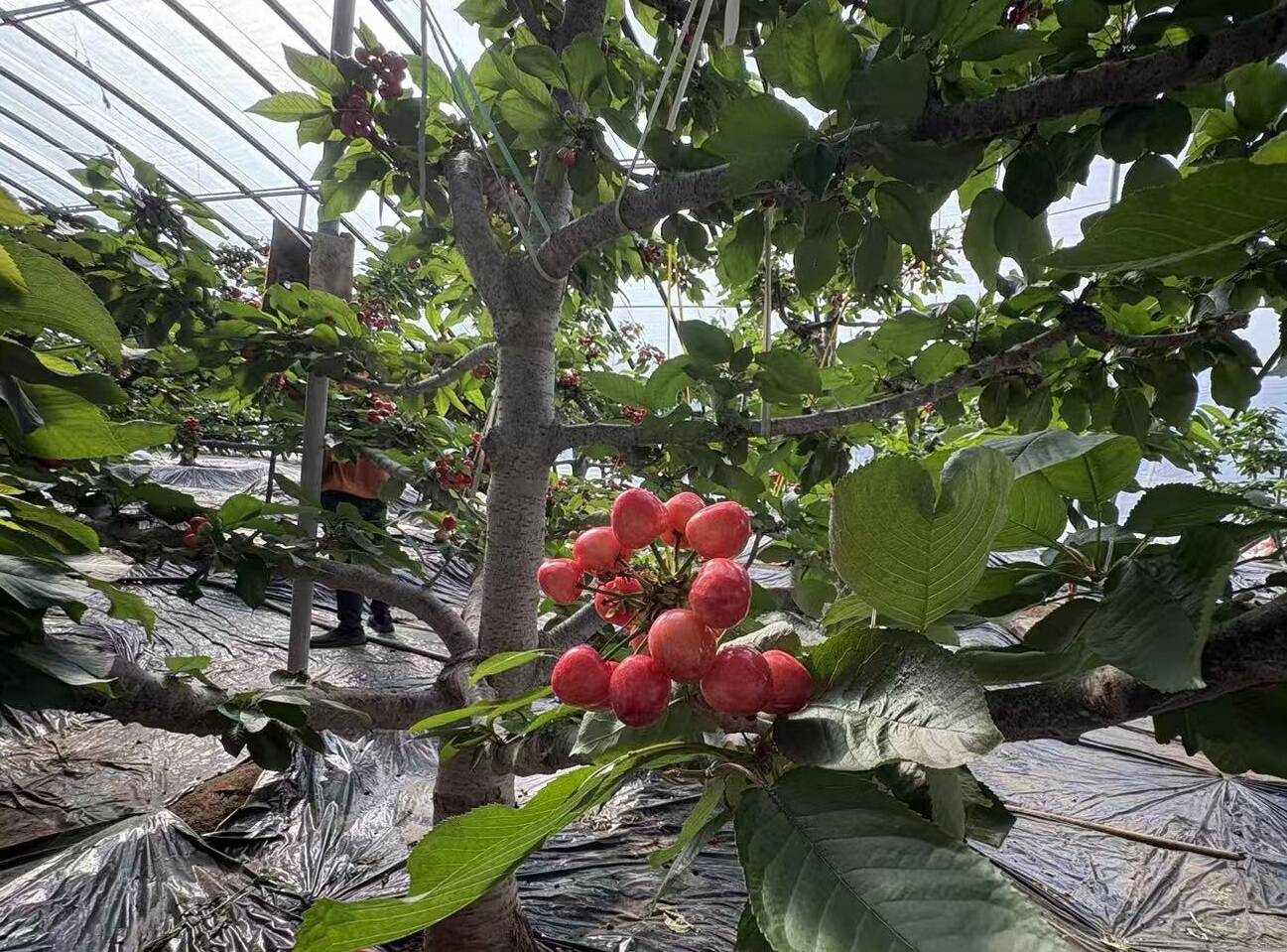 在淄川区西河镇的淄博百果大樱桃采摘园大棚里,红彤彤的樱桃挂满枝头,果农们正忙着对樱桃进行上市前的最后打理。当前正值樱桃果实膨大和品质形成的关键期,精细化的春季管理决定着未来的收成和果品质量。