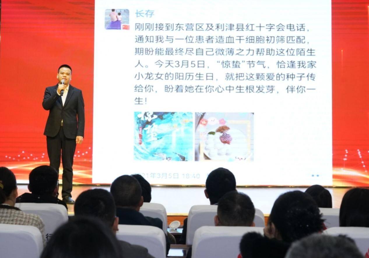 利津县医共体建设发展服务中心主任王长存,讲述了自己两次捐献造血干细胞、用爱心挽救生命的感人事迹,一句“只要人人都献出一点爱,这个世界就有温暖”的真情告白,深深打动了现场观众。