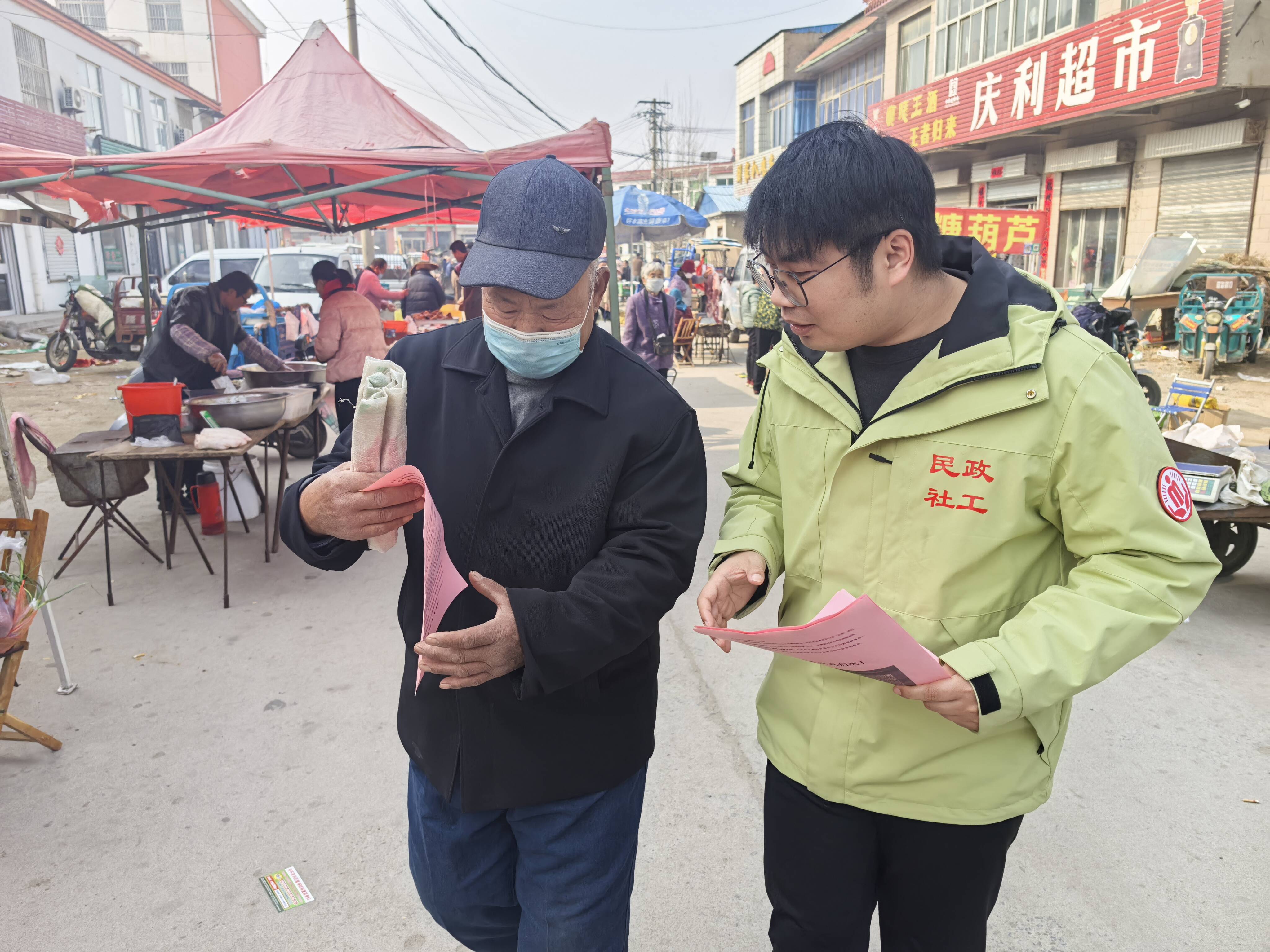 活动现场,社工人员深入集市,通过发放宣传单页、面对面讲解、现场答疑等方式,向赶集群众普及社会工作基本概念、服务内容及民政相关惠民政策。宣传单页内容简洁明了、通俗易懂,社工耐心讲解“什么是社工”“社工能做什么”“社工与志愿者的区别”等基础知识,并结合工作实际,详细介绍社工站在社会救助、养老服务、儿童福利、社区治理等领域能够提供的专业服务。同时,宣传单页上特别印制了苗山镇民政社工站微信号与抖音官方账号二维码,方便群众通过短视频直观了解社工日常工作场景及活动信息,随时随地进行线上咨询、反馈需求,进一步畅通了线上线下相结合的沟通服务渠道。