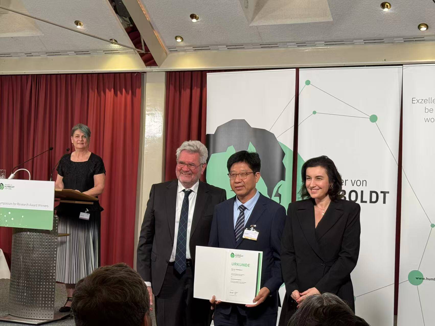 “洪堡研究奖” (Humboldt Research Award)由德国洪堡基金会于1972年创立,面向德国以外的全球杰出科学家,专门授予在基础研究、理论创新、学科引领等方面取得卓越成就,并在未来有希望继续取得尖端成就的外国杰出学者,是德国颁发给外国学者的最高荣誉。