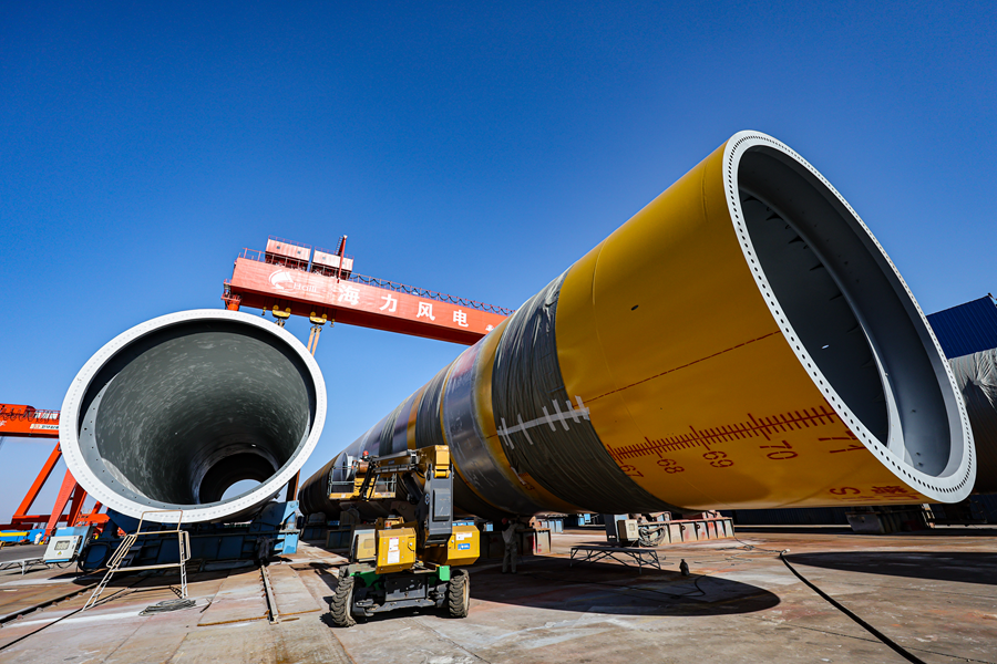 近日,在海力风电设备科技(威海)有限公司,一根根长度超70米的海上风电单桩正在进行批量生产。用不了多久,它们将经乳山港“出海”发往各地市场。